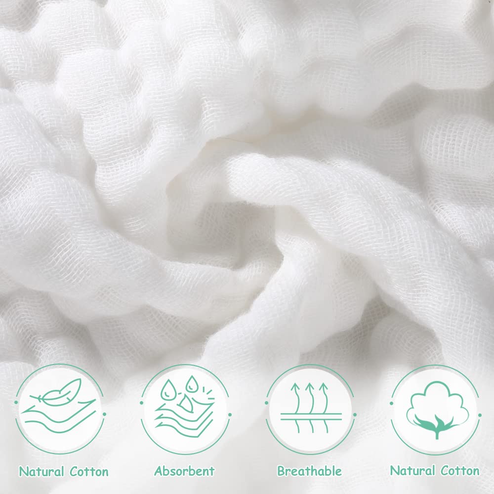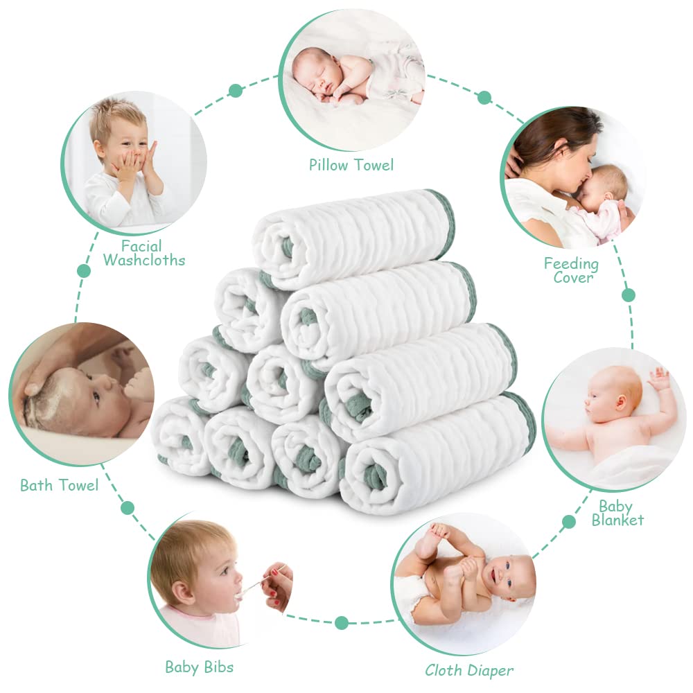 WIDE APPLICATIONS: The baby muslin cloths can be applied as burp rags, baby bibs, baby washcloths and towels, baby wipes or cloth diapers, a must-have for burping, teething or spitting up!