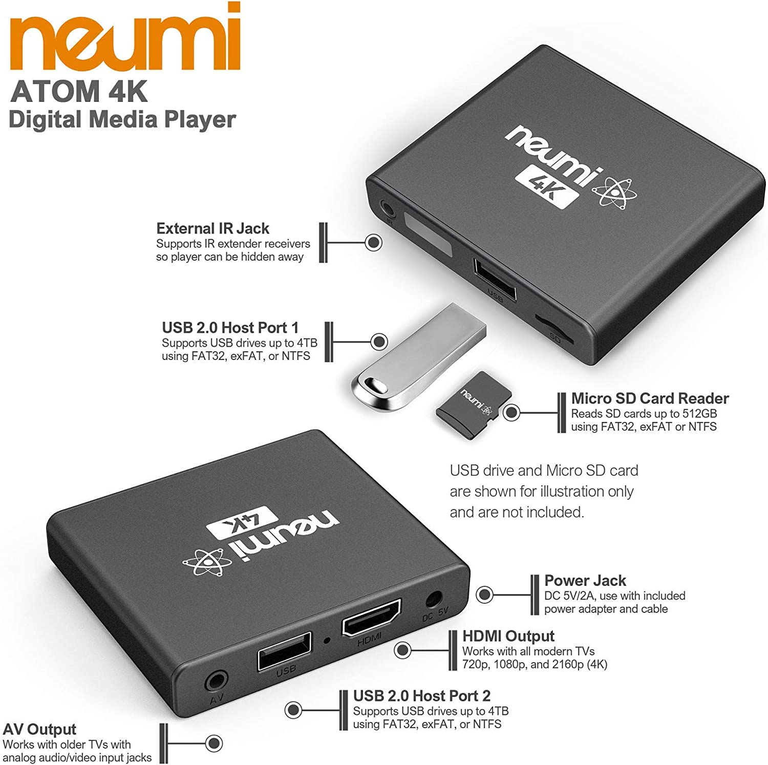 NEUMI Atom 4K Ultra-HD Digital Media Player for USB Drives and SD Cards - Plays 4K/UHD 60fps Videos, HEVC/H.265, HDMI and Analog AV, Automatic Playback and Looping Capability