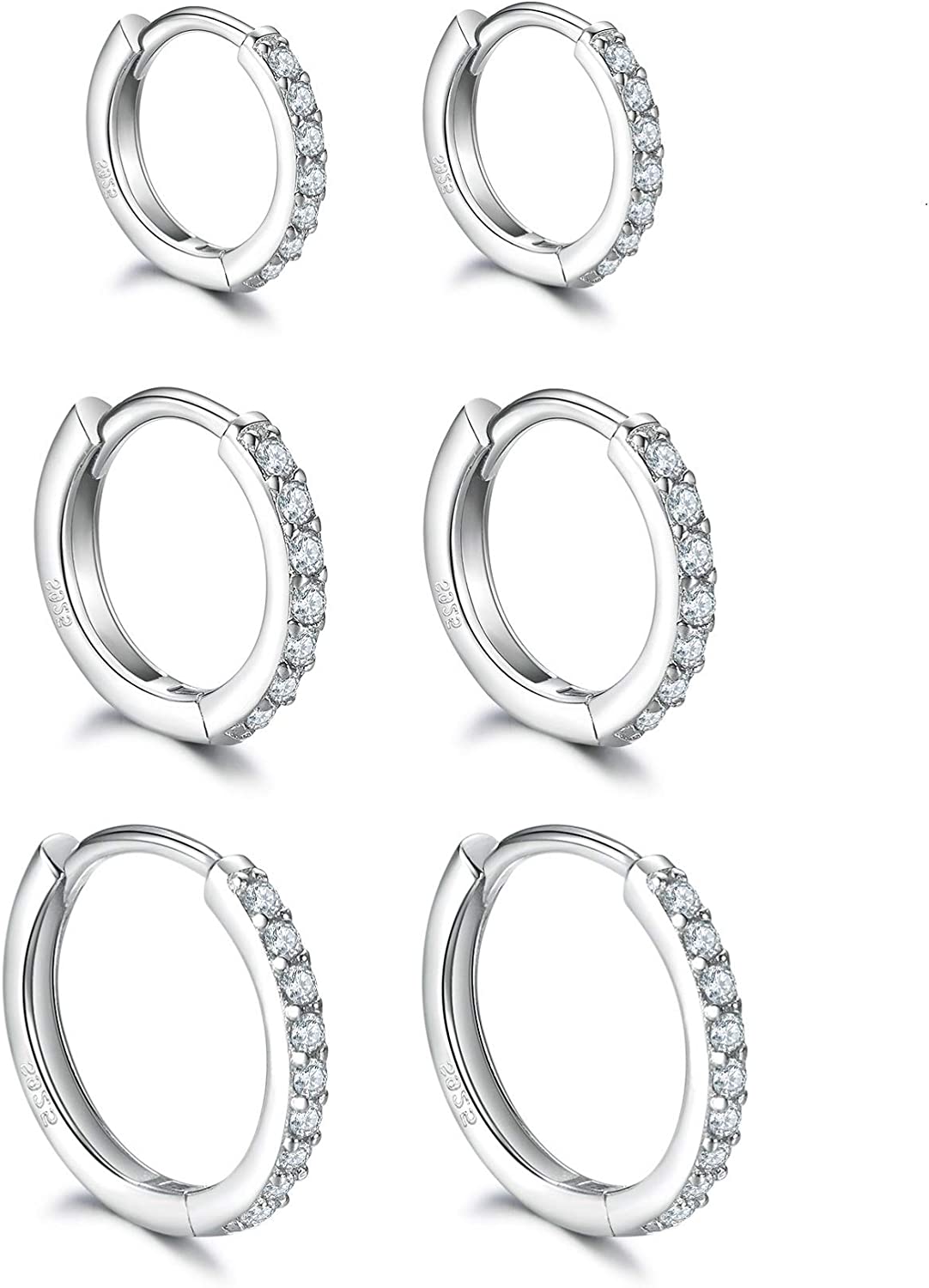 - 【PACKAGE INCLUDES】Order includes 3 Pairs 8/10/12mm(0.31/0.4/0.48in) Small Cubic Zirconia Hoop Earrings.The Small Hoop Earring is Cuff Design,Easy to Open and Close.Note:The 925 Sterling Silver Needle is very soft,Please do not Use too much Force When Opening and You can Straighten it Yourself if it bent.