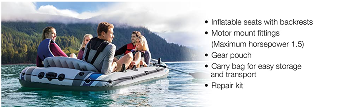 | Included Components | Intex Excursion 5, All-Around Grab Line, 5-Person Inflatable Boat Set With Aluminum Oars And High Output Air Pump, U.S. Coast Guard I.D, Repair Patch, Gear Pouch, Storage Duffel Bag |