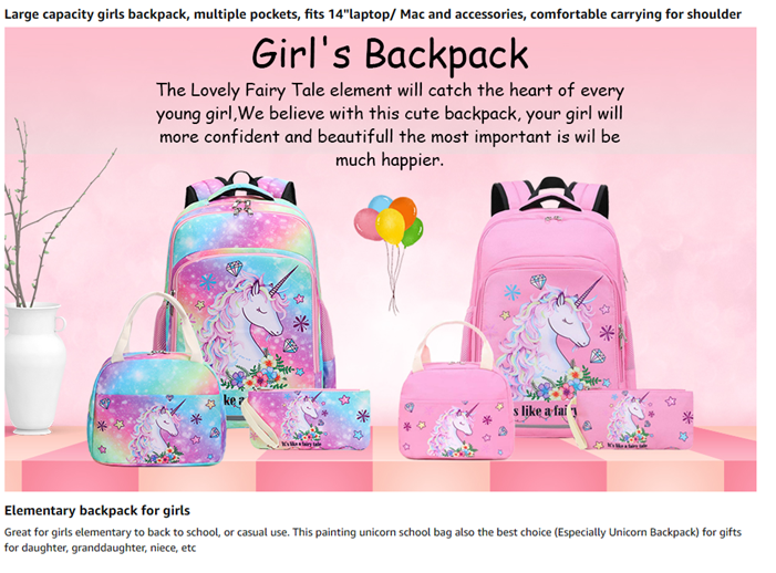 Material: This girl unicorn backpack is well made of high quality and durable Oxford with fairy tale unicorn printing, it would not fade. The 3 IN 1 kindergarten backpack set include girls Backpack + Insulated lunch tote Bag + Pencil pouch also as purse, perfect for girls to use at school days.