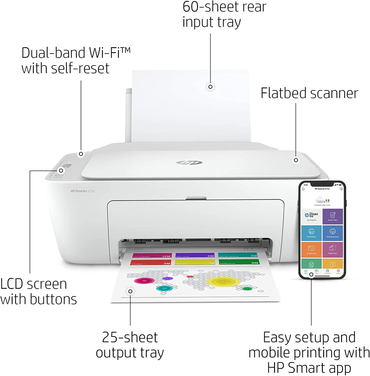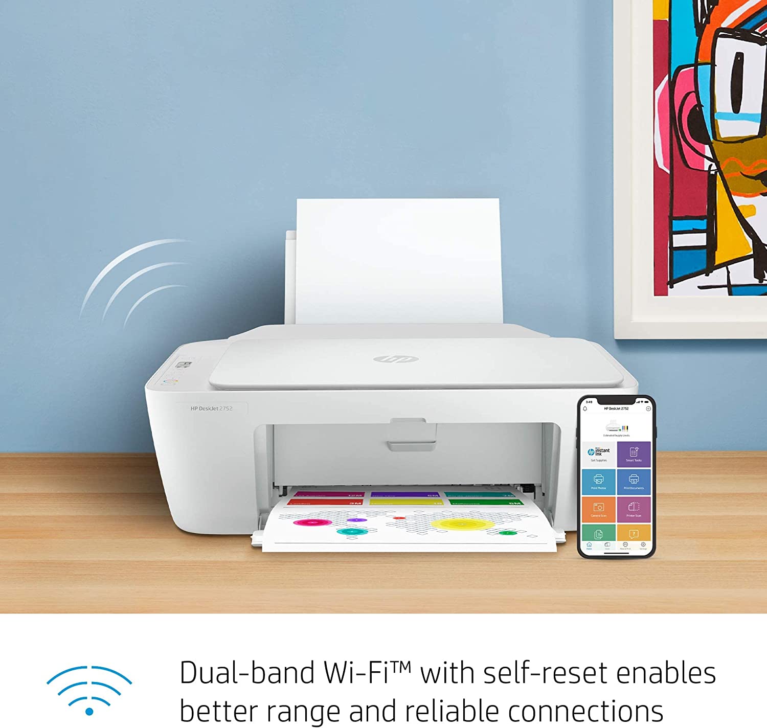 et all the essentials you need for your family in one, easy-to-use device with the HP DeskJet 2752 All-in-One Printer. Designed to deliver a hassle-free experience for printing, scanning, and copying everyday documents. Get better range and more reliable connections using dual-band Wi-Fi with self-reset. Complete projects with simple printing at home and scan and copy versatility. Use your smartphone to set up your printer in a few easy steps, then connect and print from any device using the HP Smart app. With the HP Smart app, you can also get high-quality scanning and sharing to Dropbox, Google Drive, email, or the cloud from your smartphone.