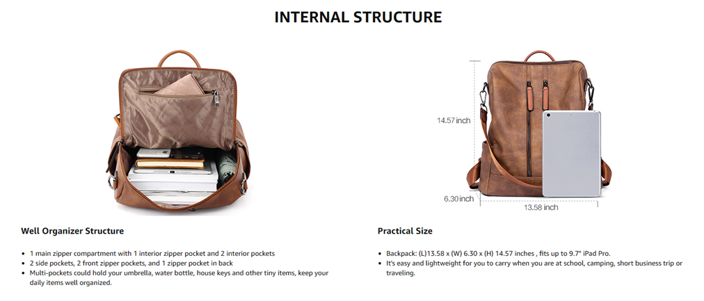 [PRACTICAL STRUCTURE]: 1 main zipper compartment with 1 interior zipper pocket and 2 interior pockets, 2 side pockets, 2 front zipper pockets, 1 zipper pocket in back. Multi-pockets can hold your 9.7" iPad Pro, magazines, umbrella, water bottle other tiny items. You can use it as everyday backpack or travel backpack.
