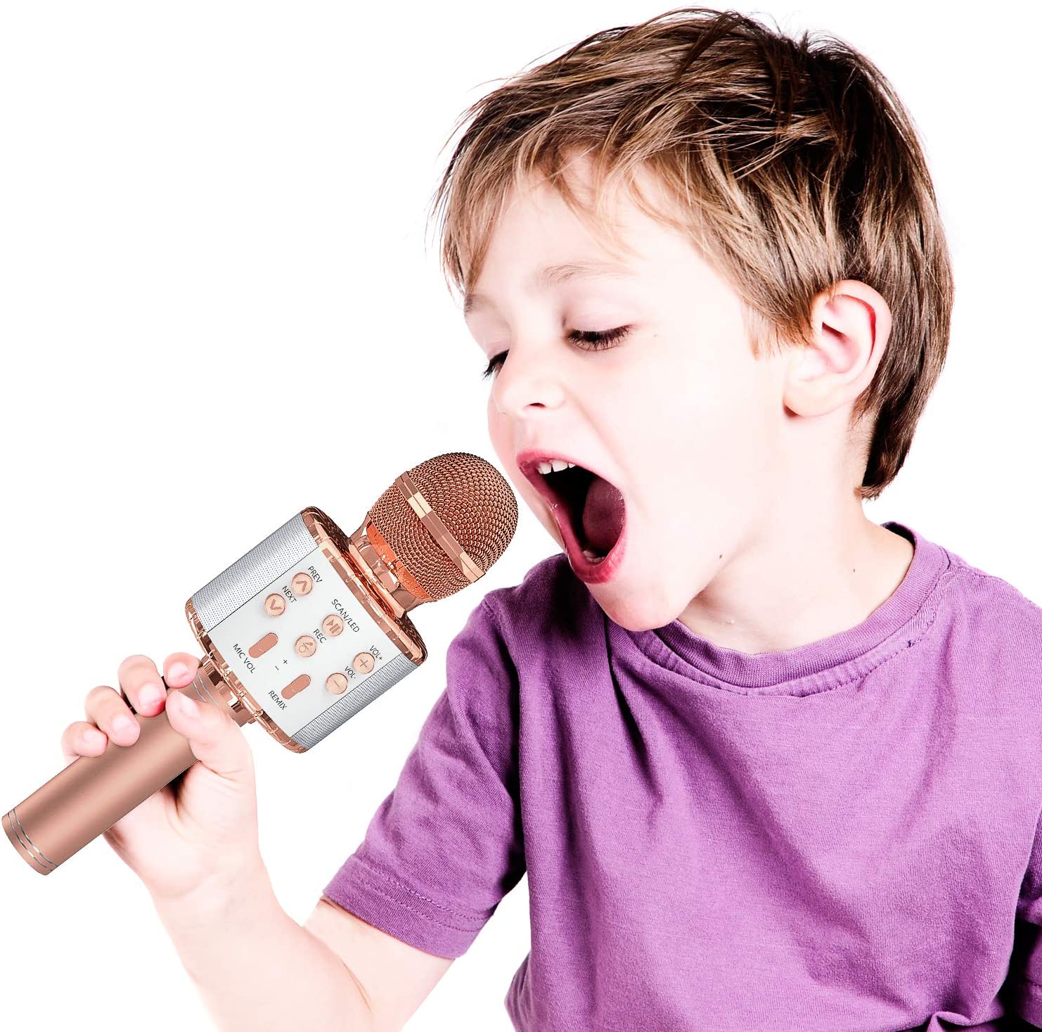 OVELLIC Karaoke Microphone for Kids, Wireless Bluetooth Karaoke Microphone with LED Lights, Portable Handheld Mic Speaker Machine, Great Gifts Toys for Girls Boys Adults All Age (Rose Gold)
