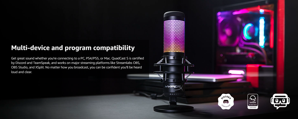 Multi-device and program compatibility: Get great sound whether you’re connecting to a PC, PS4, or Mac. QuadCast S is certified by Discord and TeamSpeak, and works on major streaming platforms like Streamlabs OBS, OBS Studio, and XSplit.