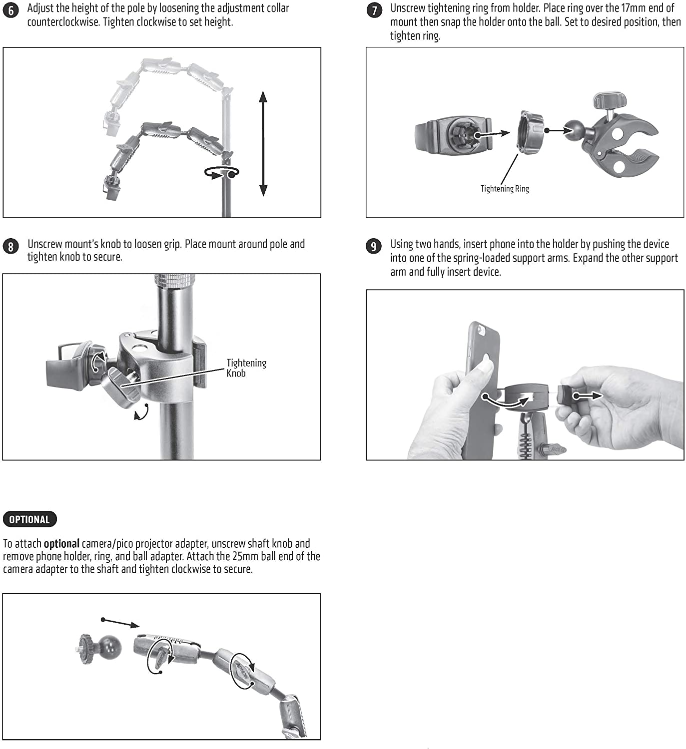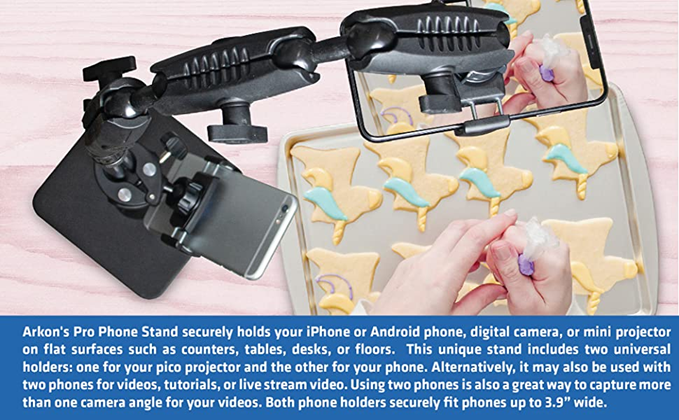 "This unique stand includes two universal holders: one for your pico projector and the other for your phone. Alternatively, it may also be used with two phones for videos, tutorials, or live stream video. PRIMARY USE: Pico Projectors (sold separately by third-party sellers ) are commonly used in the cookie decorating community. Unfortunately, the stands that come with them are usually too short, and are very flimsy. Arkon's Cookie Decorators Mount is different. It's a stand that is height-adjustable up to 43"" tall, allowing you to position your projector at the perfect height every time you use it. Many cookie decorators want to use a pico projector and also be able to use their mobile phone to record cookie decorating videos. This functionality is easy with the Cookie Decorators Mount. Insert your phone into the holder clamped onto the pole/post of the stand and tilt it downward to capture the action. For most pico projectors, the phone holder on the top arm assembly is the best way to grip your projector (those less than 3.9"" wide). However, the Cookie Decorators Mount also includes a camera adapter with standard 1/4""-20 threaded pattern, which is found on all pico projectors, digital video recorders, and cameras. SECONDARY USE: If you own two phones, you can be filming front-facing or overhead view videos with the phone holder on the top arm assembly. If in the overhead view position, you'll be able to use your phone mounted to the pole/shaft position to view the comments or your hand movements in a Facebook or Instagram live. Using two phones is also a great way to capture more than one camera angle for your videos. Both phone holders securely fit phones up to 3.9” wide, including Apple iPhone 11 Pro Max, iPhone 11 Pro, iPhone 11, iPhone XS Max, iPhone XS, iPhone XR, iPhone X, Samsung Galaxy Note 20 and Note 10, Galaxy S20, S10, and S9, and LG G6, G5, and G4."