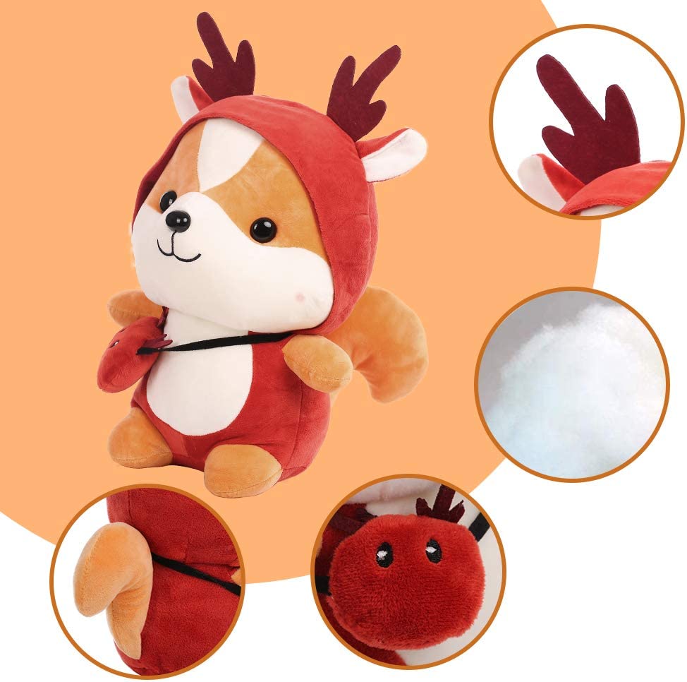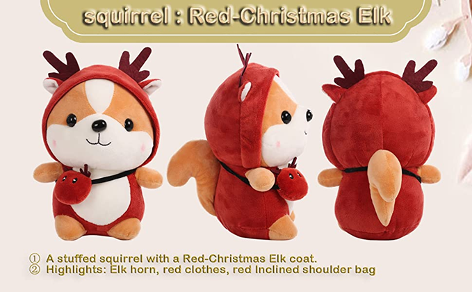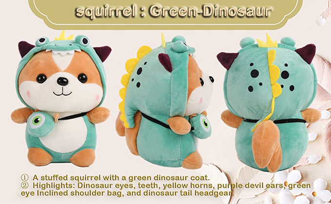• Cuddly Stuffed Animal: The squirrel stuffed animal is a soft and huggable plush toy. The cute squirrel transforms into cosplay doll, Red-Christmas Elk, Yellow-Bee, Green-Dinosaur.
