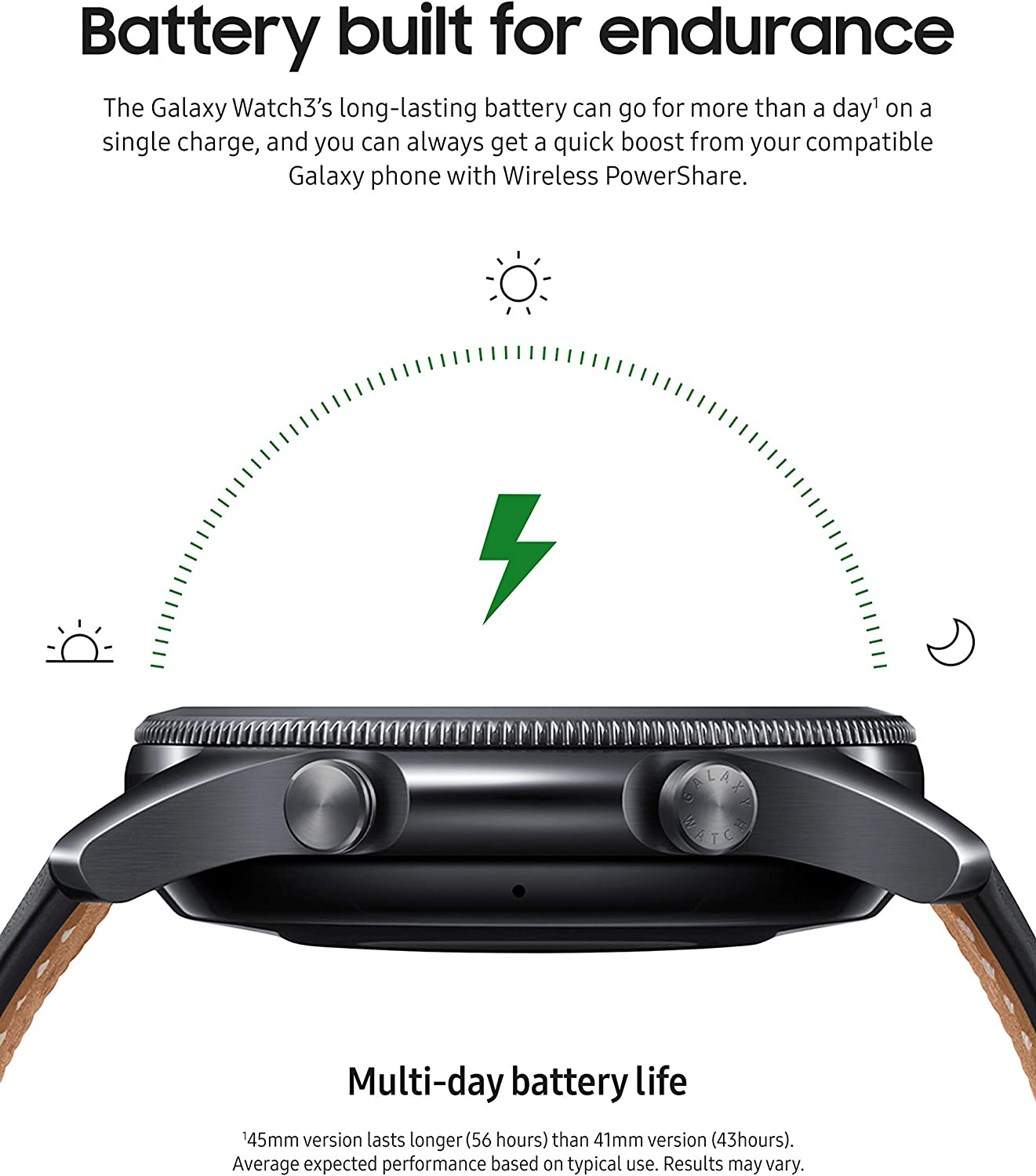 - Galaxy Watch3 combines style—two sizes, three colors, 50,000-plus watch faces and premium leather bands—with military-grade durability and water resistance.