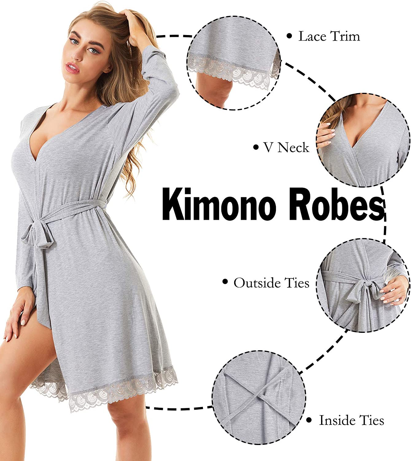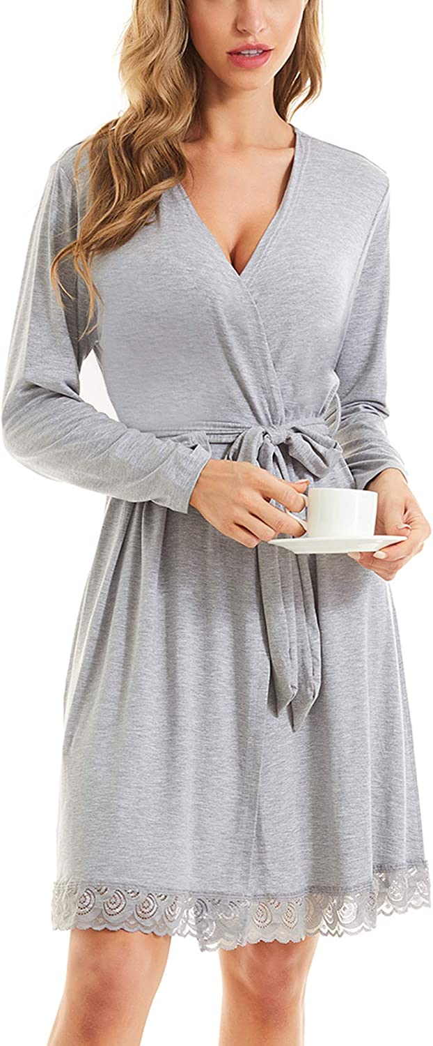 ❀Novel Design: Womens bathrobe featuring a variety of popular elements -- long sleeve, solid color, belt, lace hem, v neckline design, inside ties. Inside ties keeps it from slipping open in addition to the outside belt. Lace hem and v neckline makes you more elegant and attractive. Perfect knee length sleep robes is convenient for women night sleepwear.