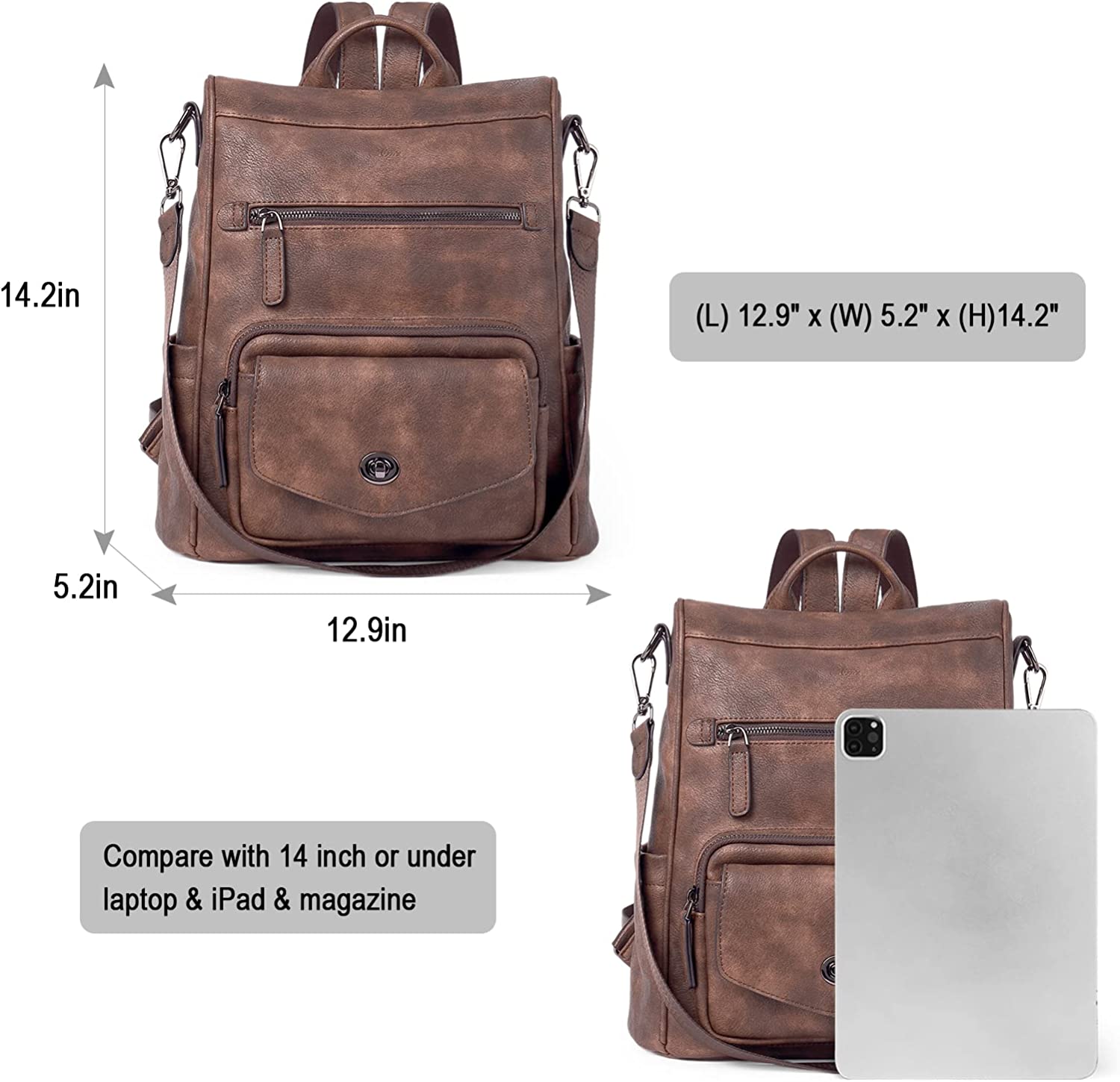 [Convertible Carrying]: (L) 12.9" x (W) 5.2" x (H)14.2" .removable strap is 12.1", you can carry it as a shoulder bag or backpack purse for women. Awesome gift for wife and women on Birthday, Thanksgiving Day, Christmas, New Year, Black Friday, Cyber Monday.