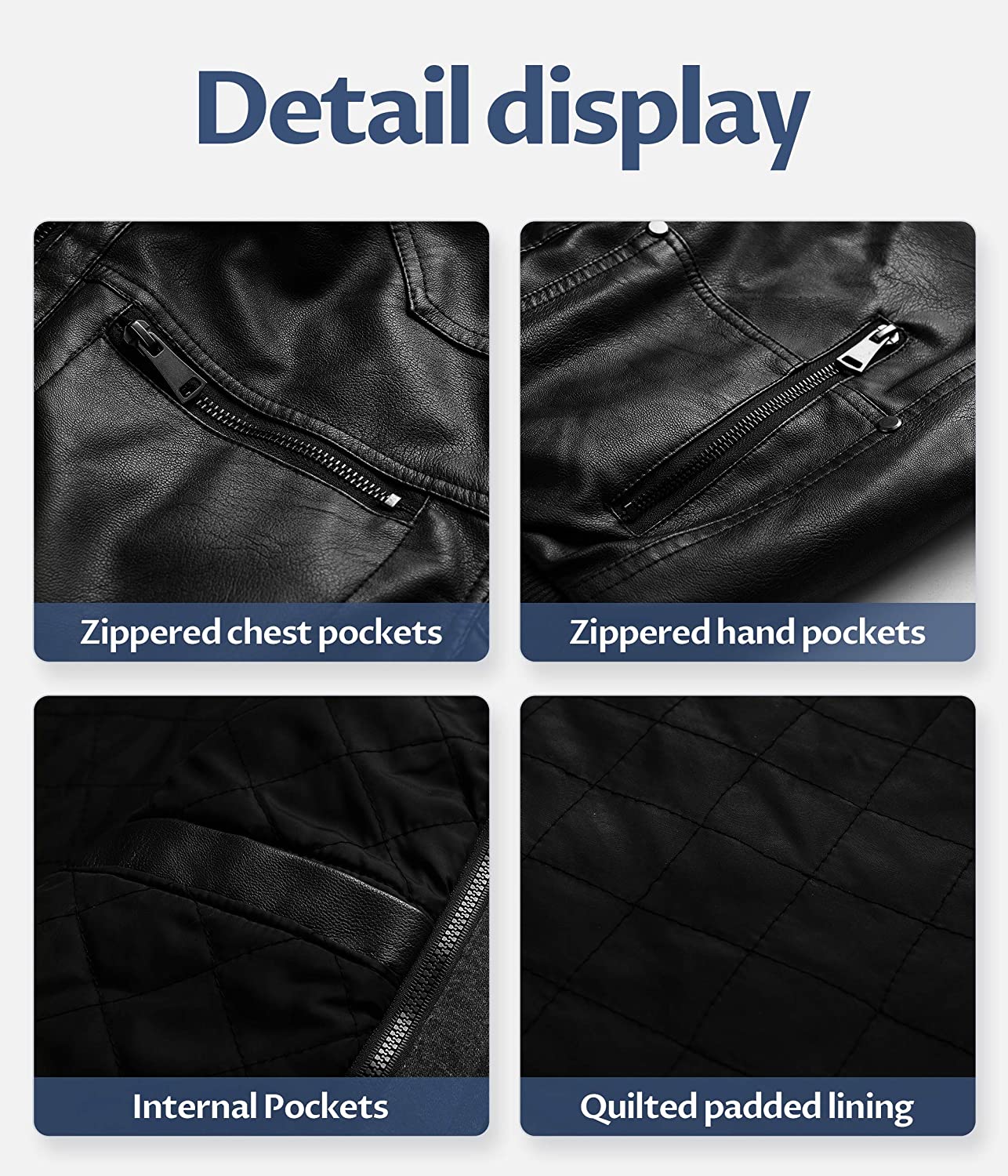 ▶ 2 style design--Leather coat with removable hooded is design for different looks between stylish hooded riding jacket and casual stand collar winter jacket.