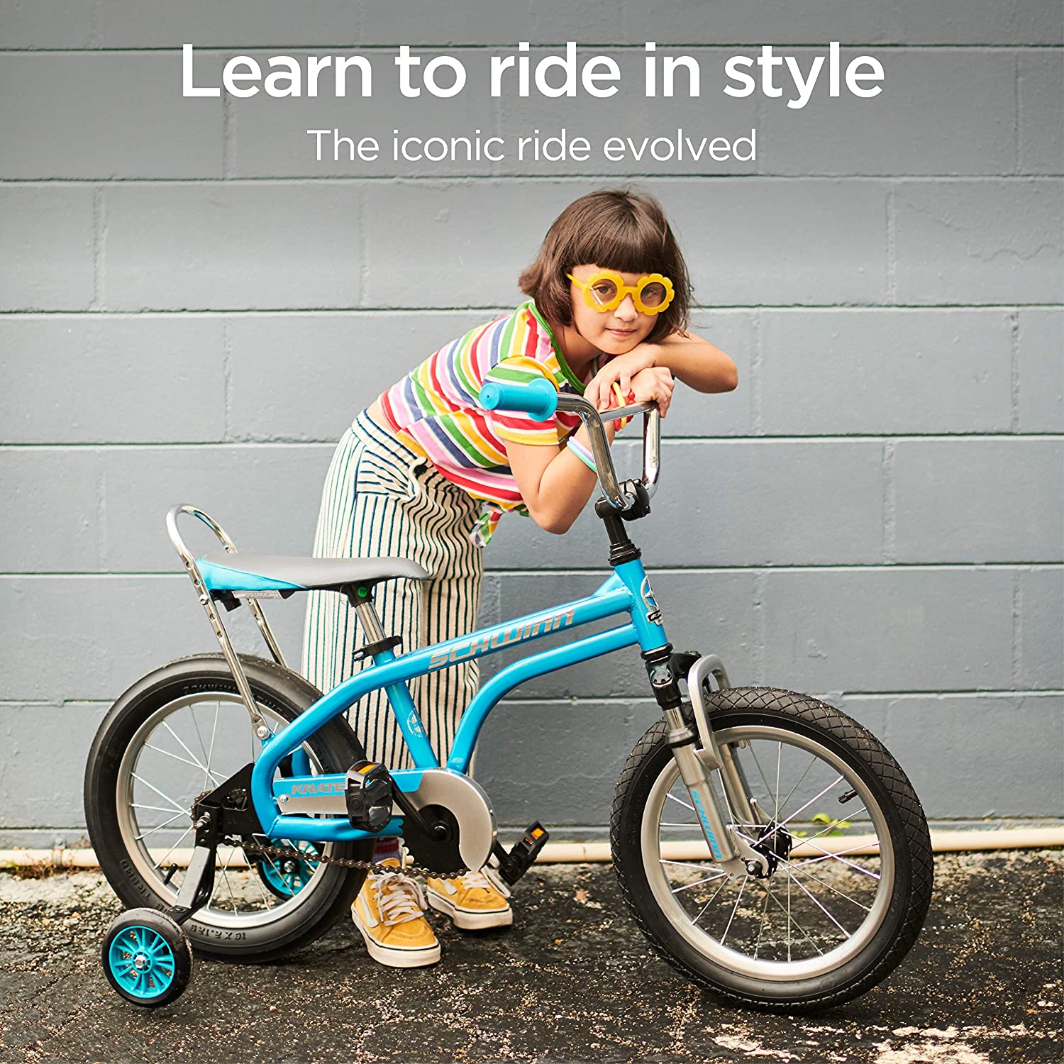Adventure has a new name. From learning to ride to racing down the sidewalk, outdoor fun is just a pedal away with the Krate EVO kids bike by Schwinn. The Krate EVO blends classic style with modern technology for a ride that’s as iconic as it is comfortable.  The steel frame features a double top tube and Sting-Ray inspired shapes, while the SmartStart geometry offers kids a better fit for a more stable, confidence-boosting ride.  But we didn’t stop there. The fully functional suspension fork, re-imagined racing bucket-style saddle, and authentic Slik rear tire put a fresh twist on that classic 70’s Krate look. The single speed drivetrain, rear coaster (pedal) brake, and removable skate-style training wheels make this bike simple and intuitive for young riders to use.  Like all Schwinn bikes, the Krate EVO comes with a limited lifetime warranty for as long as you own the bike.  Teach your child to ride and make memories together with the Krate EVO.  Enjoy the freedom of riding a Schwinn.