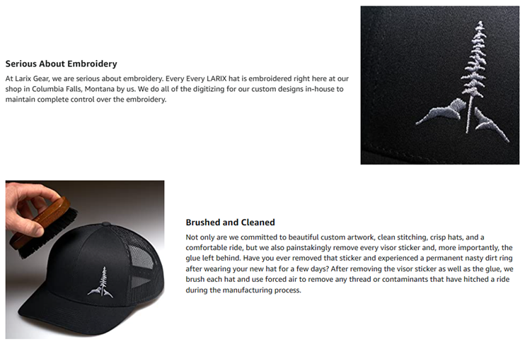 - SERIOUS ABOUT EMBROIDERY : Every Larix hat is embroidered right here at our shop in Columbia Falls Montana by us. It's our highest priority to achieve outstanding results by using the most advanced sewing technology and techniques available today.