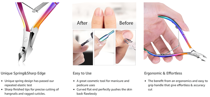 - ? Perfect Jaw Design And Dual End Cuticle Pusher: The nail nipper could easily scraper the cuticle or nail gels, even in small areas around nails. The spoon-shaped and triangle designed cuticle pusher could remove residues without pulling or tugging.