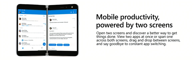 Two ultra-thin, high-resolution touchscreens open to reveal new possibilities on a mobile device. Designed to help you be productive, Surface Duo features multiple modes, the best of Microsoft 365 mobile experiences, every Android app in the Google Play store, and new dual-screen enhanced apps. Now you can view two apps at once or span one across both screens, drag and drop between screens, and make phone calls. Say goodbye to constant app switching.