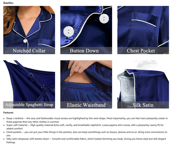 【Pajama Features】--- ❤Cami top: The cami features with an adjustable spaghetti strap so you can easily adjust its length. Sexy V-neck, inspires sultry flirt and your sexy.❤Satin sleepshirt: Loose-fitting and buttoned with brand characteristics sleepshirt features short sleeve, a chest pocket and notched collar with contrast piping along collar, front placket, sleeve and pant hem. ❤Pants and Shorts: Designed with elastic waistband to make you wear more comfortable and close-fitting.