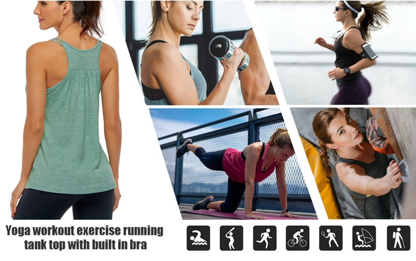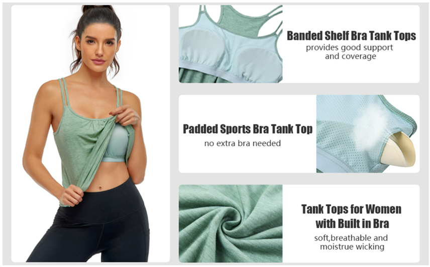√Built in Bra: Designed for low impact. Shelf bra tank tops built in removable pads gives a comfort feel, provides light support and coverage. You can also take off the pads and wear a sports bra under for high impact.
