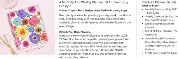 Plan your year in style with the beautiful florals and bold color palette of the 2021-2022 academic year Mahalo collection. This stylish CYO (create your own) cover planner will keep you organized everywhere you go. Add in your favorite photos, sentiments, notes or memories to the clear cover pocket, and keep organized with dated weekly and monthly pages inside for easy scheduling. Fresh page designs add a touch of style and offer plenty of room for all of your important information. Designed with practicality and ease of use in mind, this academic agenda's monthly calendar tabs allow for easy access to each month’s plans while weekly views offer ample writing space for detailing each day. High quality white paper provides clean writing space for jotting down your appointments, to-dos and reminders. Durable coated tabbed dividers are long lasting and make accessing information a breeze. Use this dated academic planner to keep track of your appointments, and to write down notes and ideas in one place. Premium quality covers and twin-wire binding provide reliable durability for daily use. Stay on track throughout the academic year with this 8.5 x 11 planner dated July 2021 - June 2022. Mix and match with other Mahalo Collection planning products from Blue Sky to organize your daily life. Blue Sky creates modern and sophisticated organizational planners and calendars to fit the scheduling needs of busy people - whether it’s for business professionals, college students, teachers, or anyone with appointments to make note of. Keep your life organized with our full line of products including desk pad calendars, wirebound tabbed weekly and monthly planners with contacts and notes pages to accommodate your scheduling needs, and laminated two-sided wall calendars, all in a variety of colors and patterns to suit your lifestyle and personality.