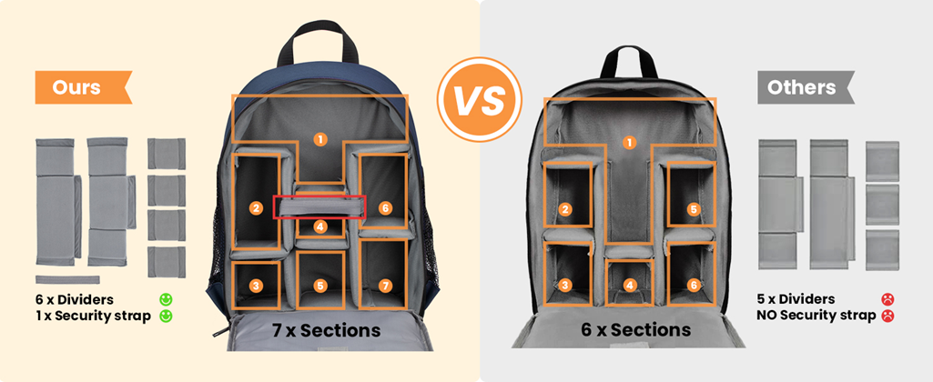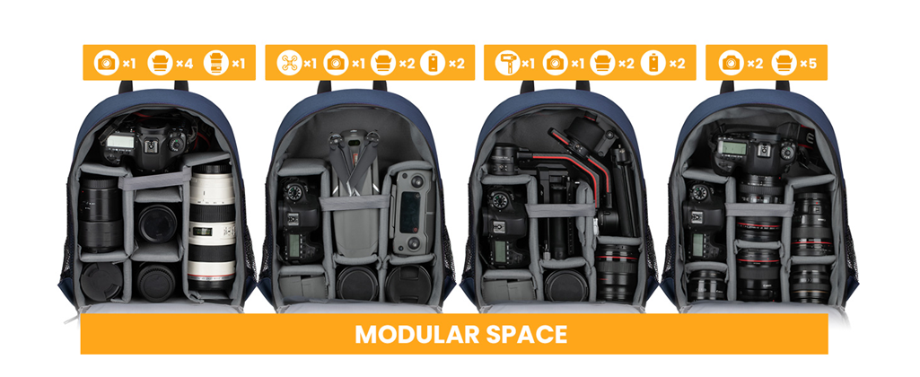 Dedicated camera compartment with removable padded dividers; fits 1 camera 6 lenses at once. Can be used as a daily backpack just take out the dividers to arrange your various daily goods such as clothes, cellphones, books, and so on.