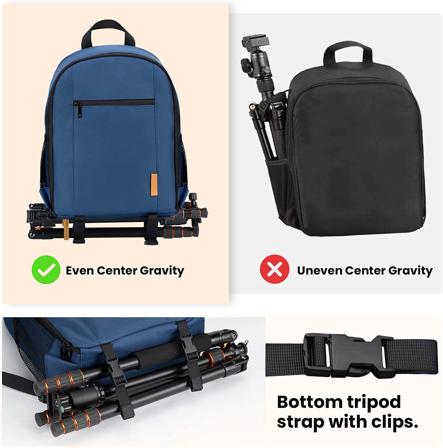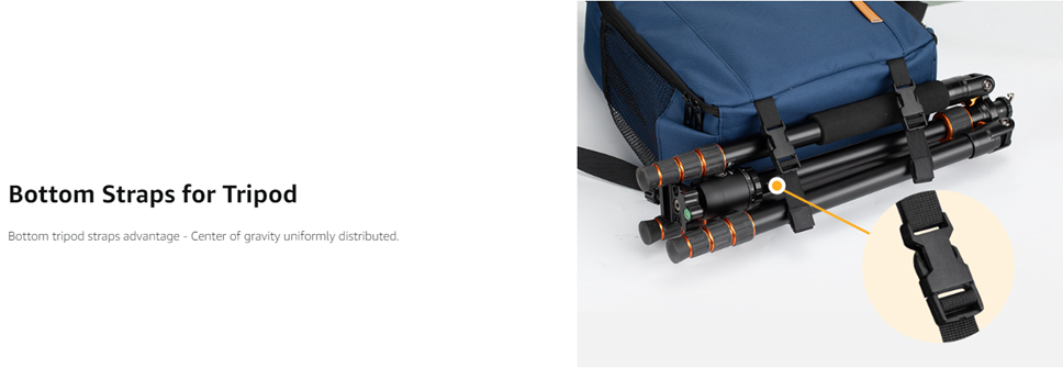 - 【BOTTOM TRIPOD STRAPS WITH CLIPS】Tripod or monopod can be attached to the bottom with straps which does not alter the center of gravity because the weight of both the tripod and the backpack are uniformly distributed, which aids comfort when carrying.