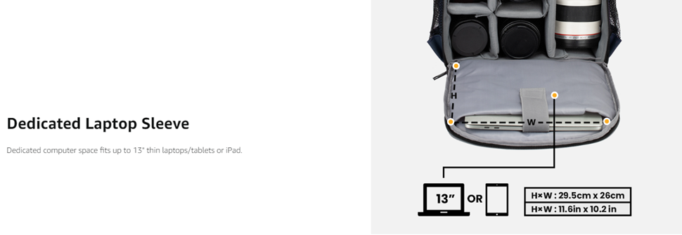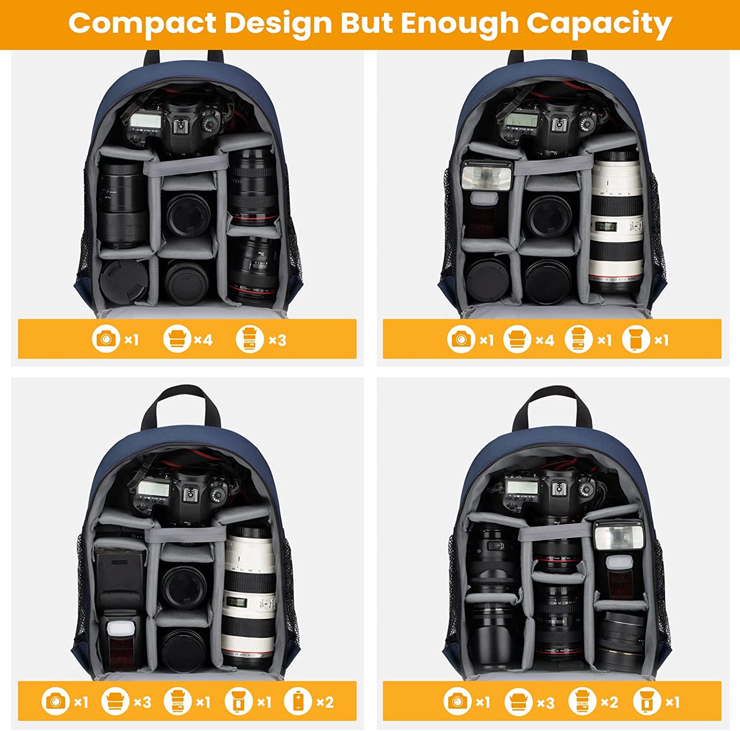 - 【COMPACT DESIGN BUT ENOUGH CAPACITY】 This camera and lens bag provides 7 rooms with 6 pieces padded removable dividers and 1 security strap which can hold 1 camera 6 lenses, while you can DIY the inner space by removing the thick dividers based on your equipment. Inside there is a dedicated sleeve for a 13" laptop or tablet/iPad. Bottom straps for tripod attachment. The front of the camera gear backpack has a zippered pocket for accessories. Mesh pockets on both sides for bottle and umbrella.