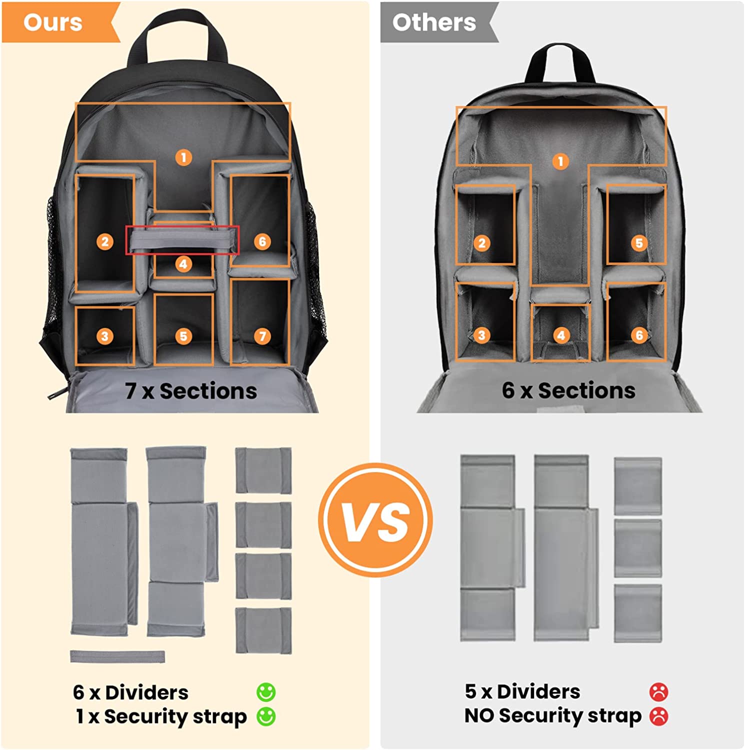 - 【COMPACT DESIGN BUT ENOUGH CAPACITY】 This camera and lens bag provides 7 rooms with 6 pieces padded removable dividers and 1 security strap which can hold 1 camera 6 lenses, while you can DIY the inner space by removing the thick dividers based on your equipment. Inside there is a dedicated sleeve for a 13" laptop or tablet/iPad. Bottom straps for tripod attachment. The front of the camera gear backpack has a zippered pocket for accessories. Mesh pockets on both sides for bottle and umbrella.