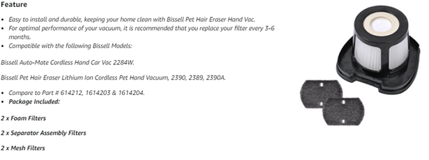 | Compatible Device | Bissell Auto-Mate Cordless Hand Car Vac 2284W and Bissell Pet Hair Eraser Lithium Ion Cordless Pet Hand Vacuum, 2390, 2389, 2390A |