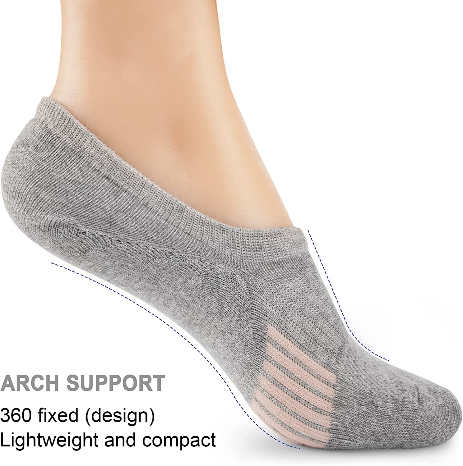 ARCH SUPPORT & CUSHION SOCKS - Upgraded cushion sole covers the entire bottom of the no show socks. Provide maximum cushioning space for the foot, reducing friction in sports or daily activities. Proper compression of the arch will keep your arch safe and stable while reinforced heel and toe provide outstanding durability.