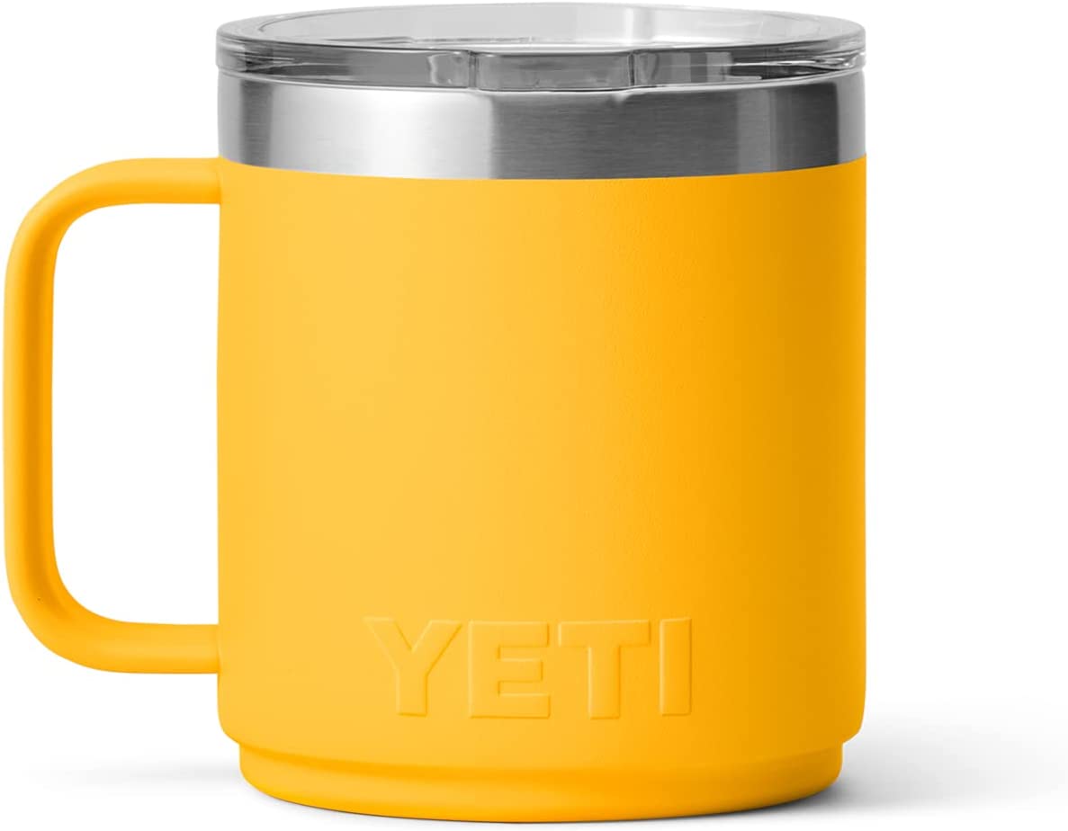 - The YETI 10 oz. Rambler Mug stands 4 inches high and has a lip diameter of 3.5 inches, and with the handle its almost 5 inches’ wide