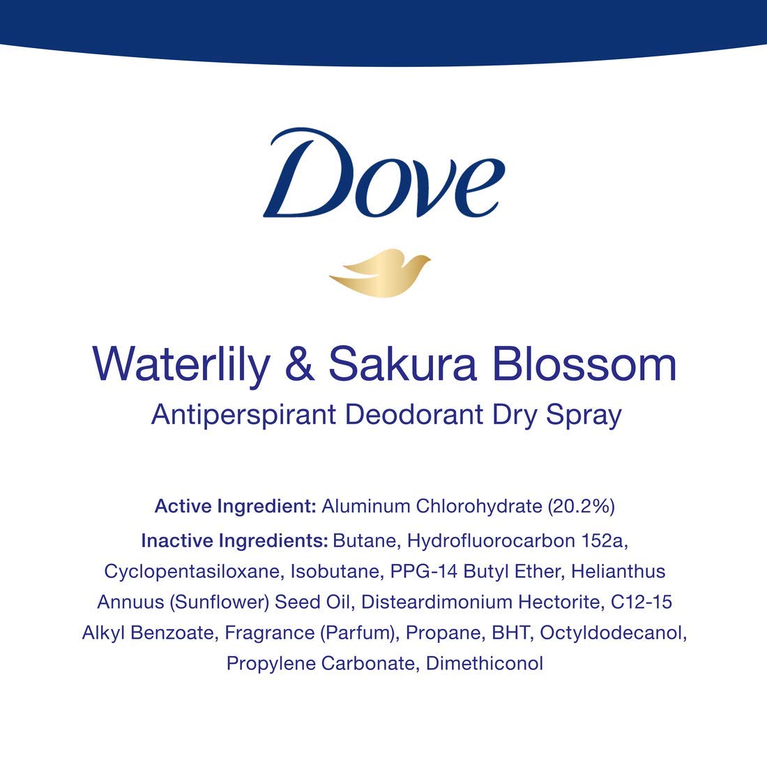 Who doesn't dream about a calm morning routine? Our calming ritual dry Spray Antiperspirant Deodorant waterlily & Sakura blossom is just the thing to keep you feeling calm, comfortable and confident first thing in the morning, without compromising on care and all-day protection. This Dove Nourishing secrets dry Spray Antiperspirant Deodorant for women will help you transform your daily self-care routines into luxurious rituals. Inspired by self-care rituals of real women, Made with 0% alcohol (ethanol) and enriched with Dove 1/4 moisturizers, this non-irritating antiperspirant formula leaves you with comfortable, beautifully soft underarms while keeping underarm sweat and odor at bay for up to 48 hours. But that's not all. This dry spray combines the sophisticated, sparkling scents of waterlily and Sakura blossom with comforting notes of sandalwood in a nature-inspired fragrance that's been created with responsibly sourced ingredients - so you can enjoy a calming ritual without compromising on care. It'll infuse your days with a small, but indulging ritual that's there for you and you alone, no matter what. For best results, Spray each underarm with two or three short bursts from about 6 inches away. Apply this Dove Antiperspirant Deodorant to dry skin after showering and enjoy fresh, comfortably dry skin from morning to night. This antiperspirant deodorant spray dries instantly, so you don't have to wait or worry.