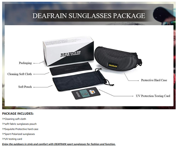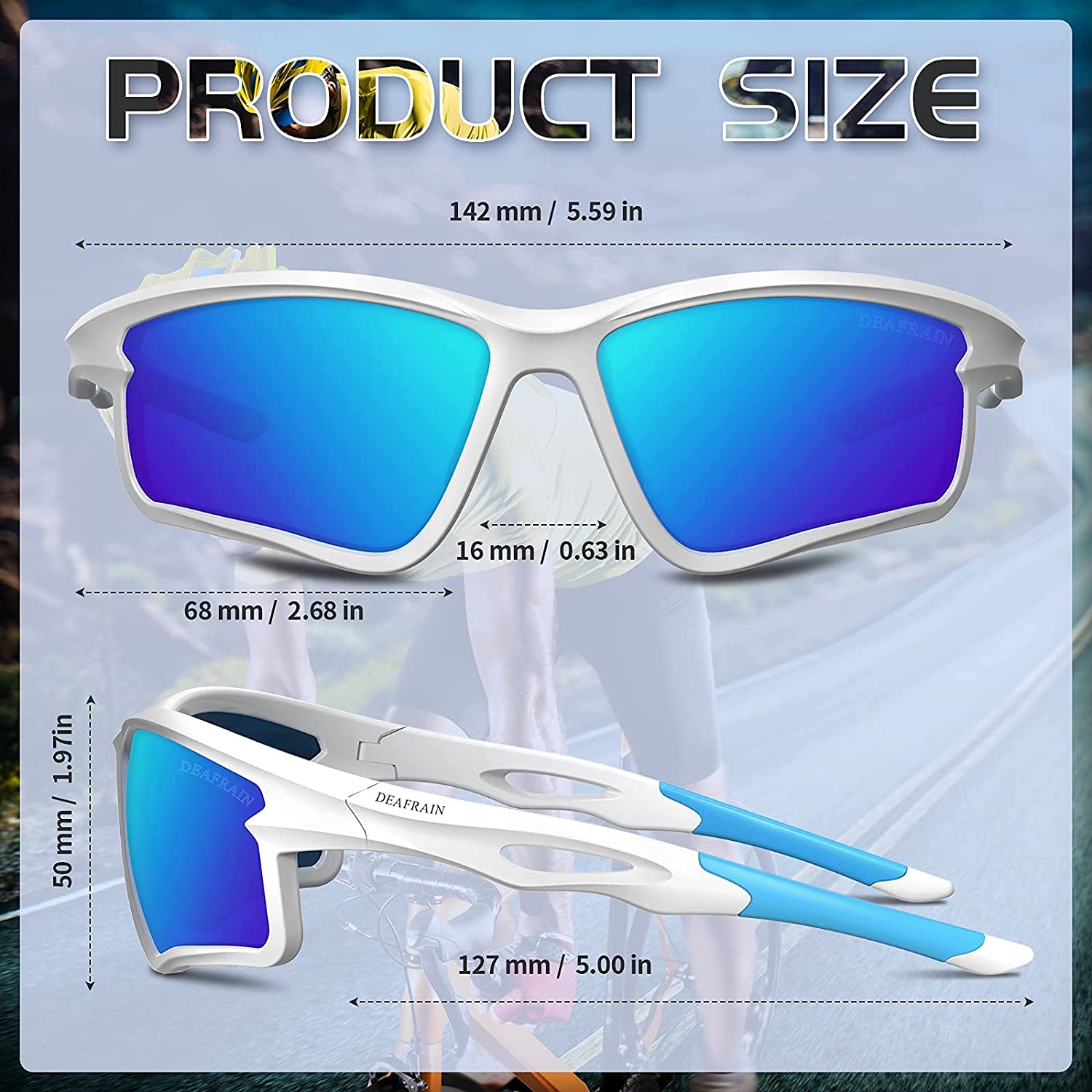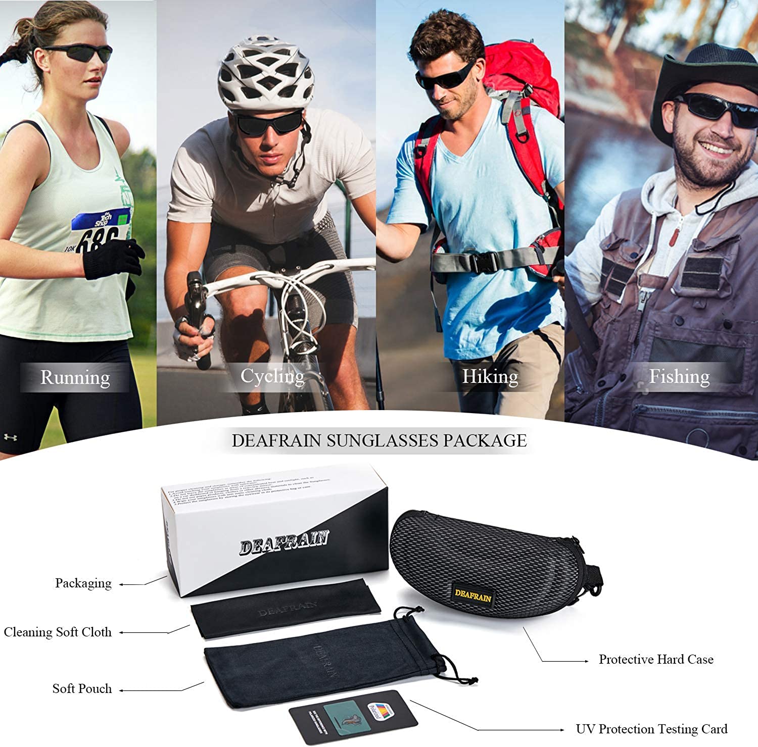 {EXCELLENT HD POLARIZED LENSES} -1.0mm polarized TAC scratch-resistant lenses with 100% UV protection against the sun's harmful rays.DEAFRAIN polarized lenses offer high contrast, perfect clarity and peak visual acuity. Not only perfect for your weekend adventures, but also an excellent choice of your weekday commute.