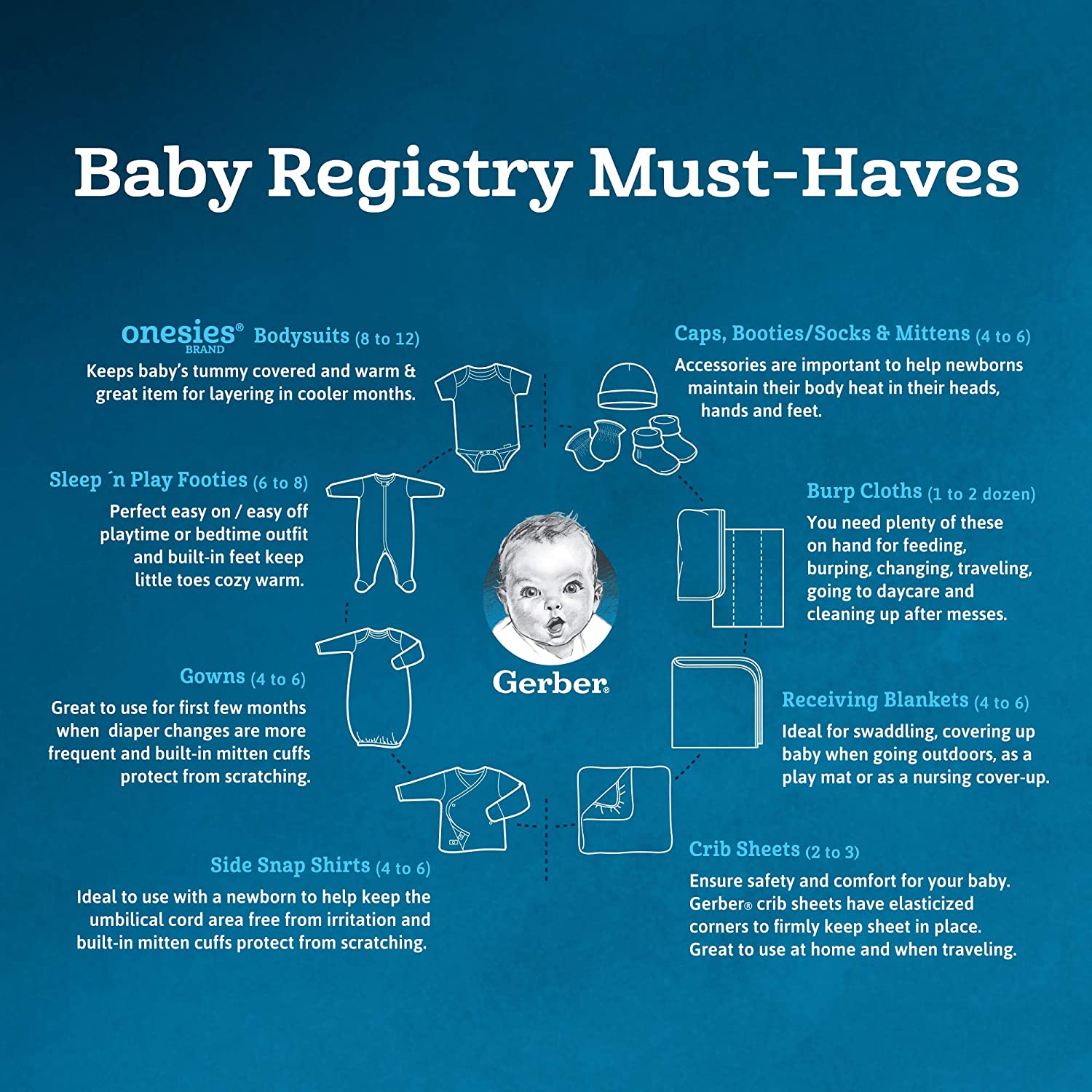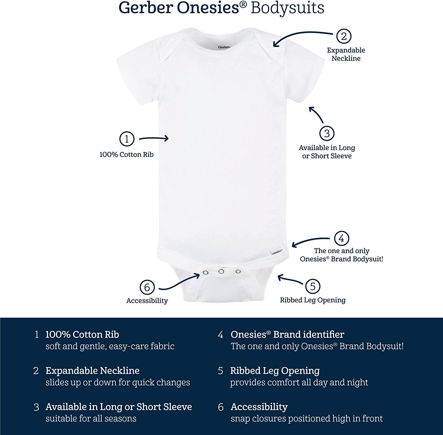 • Includes eight white Gerber short sleeve onesies bodysuits