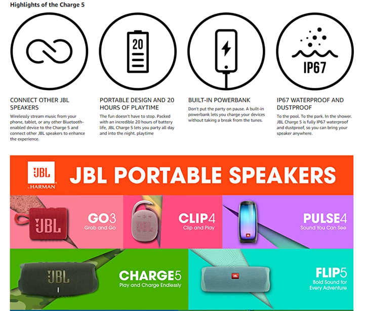 Take the party with you no matter what the weather. The JBL Charge 5 speaker delivers bold JBL Original Pro Sound, with its optimized long excursion driver, separate tweeter and dual pumping JBL bass radiators. Up to 20 hours of playtime and a handy powerbank to keep your devices charged to keep the party going all night. Rain? Spilled drinks? Beach sand? The IP67 waterproof and dustproof Charge 5 survives whatever comes its way. Thanks to PartyBoost, you can connect multiple JBL PartyBoost-enabled speakers for a sound big enough for any crowd. With all-new colors inspired by the latest street fashion trends, it looks as great as it sounds.