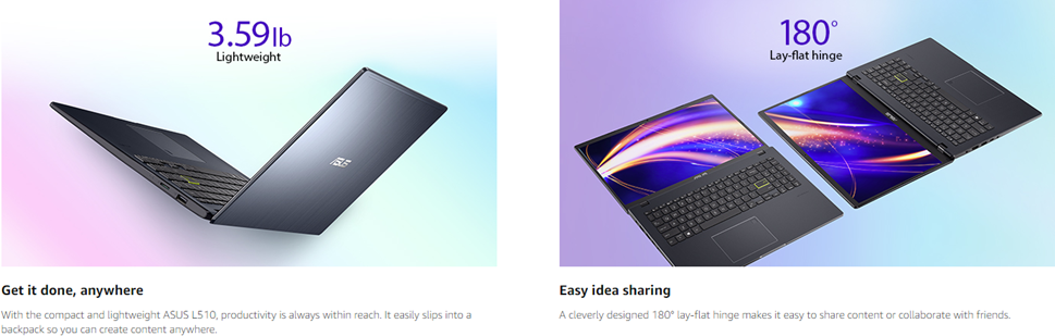 The ASUS Laptop L510MA is designed to help you be productive all day — even when you’re on the move. This compact and lightweight 14 inch laptop is powered by the latest Intel® processor and provides long lasting battery life. With eMMC storage and pre-loaded Windows 10 in S mode, it offers full compatibility with a wide range of software and peripherals. It’s the best laptop for people on the go. *The actual transfer speed of USB 3.0, 3.1, 3.2 (Gen 1 and 2), and/or Type-C will vary depending on many factors including the processing speed of the host device, file attributes and other factors related to system configuration and your operating environment. For Free Windows 11 upgrade eligible devices, visit ASUS Windows 11 website for more information.