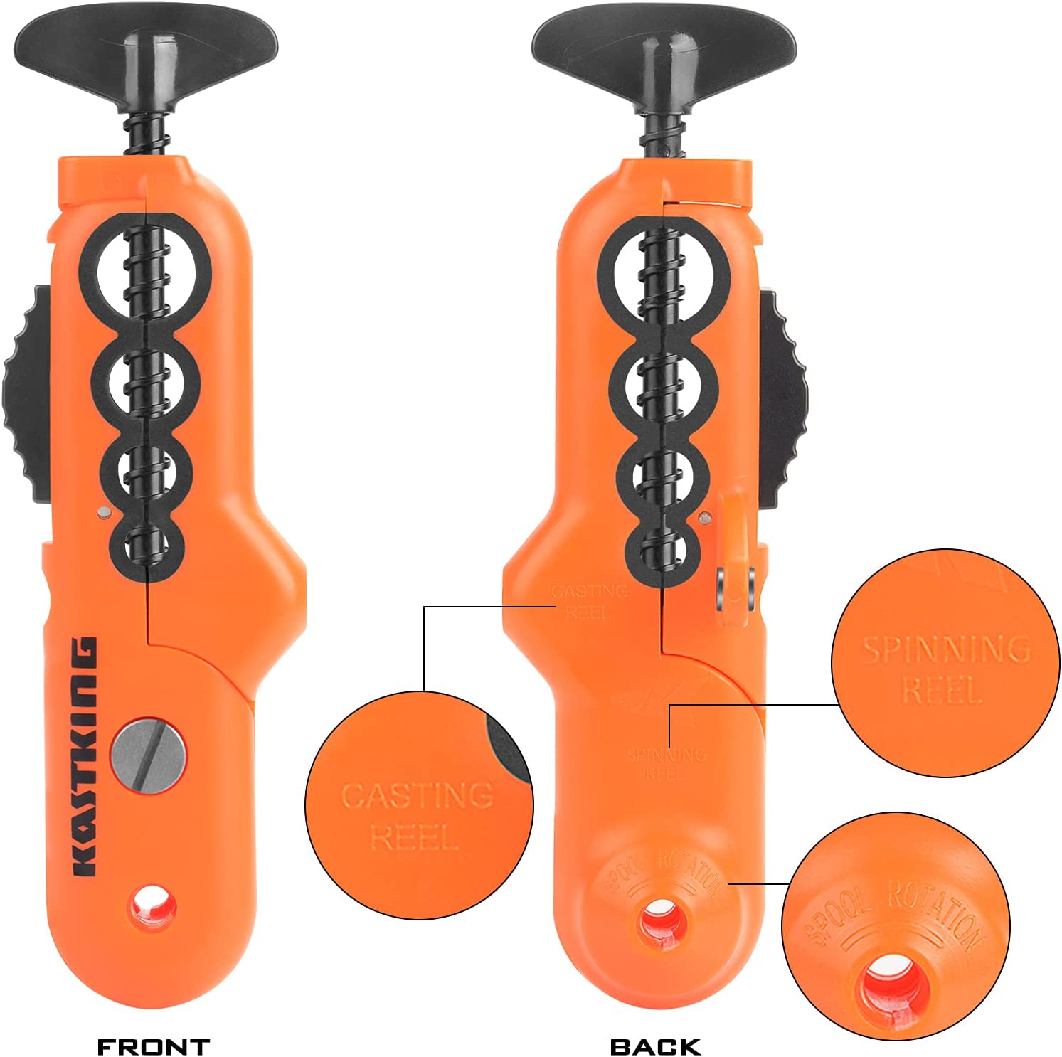 - PATENT PENDING LIINE SPOOLING TOOL– The innovative KastKing patent pending line spooler design is simple to use and can spool both spinning reels and baitcasting reels without any line twist. Rubber coated clamp points firmly grip nearly any size rod without damaging your fishing rod and tension bands can be adjusted to apply the ideal line tension during the spooling process. Made with non-rusting ABS materials.