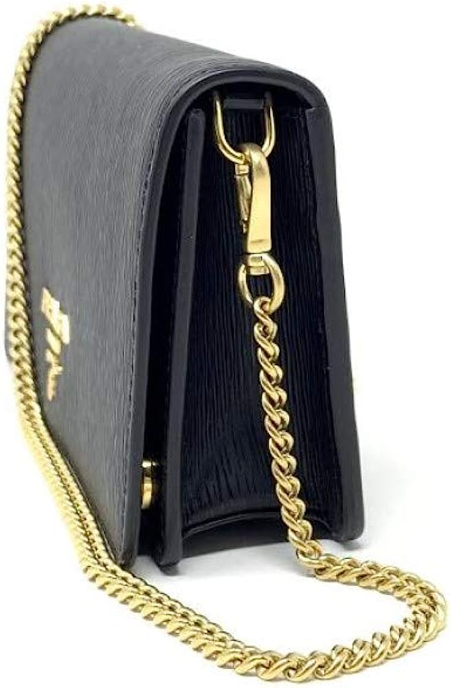 Black Nero. Vitello Move I Leather. Small Miniborse Crossbody/ Chain wallet. Gold Hardware with front triangle Prada logo. Magnetic Snap Closure.
