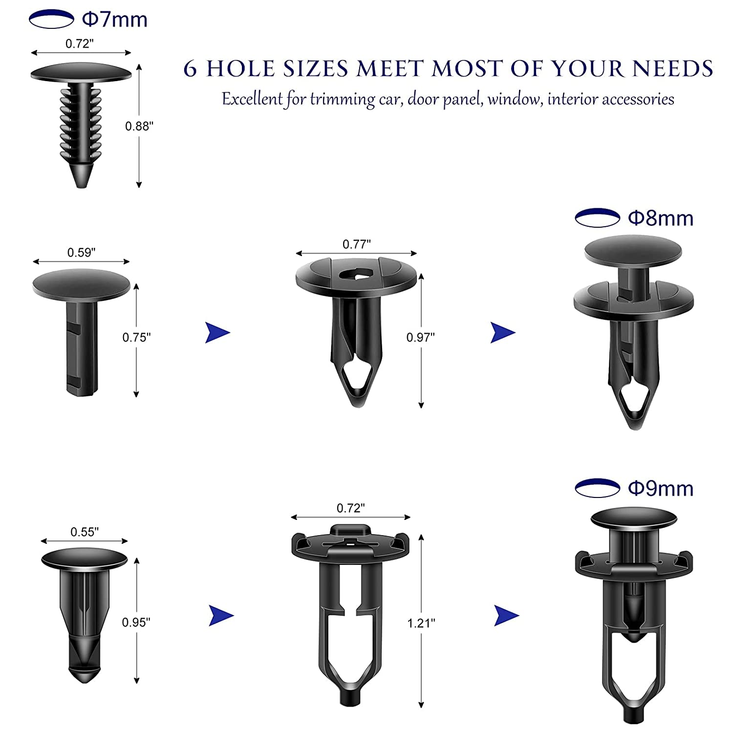 Widely Application : Great Assortment Push Retainer Kit with 6 popular size, push clips are widely used for trim panel clips, door trim clips, door panel clips, bumper clips, Fender clips, engine cover and splash shield retainers replacement for Ford, GM, Chrysler, Toyota, Honda.