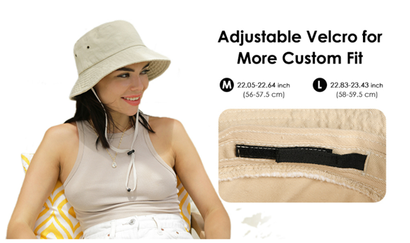 • Cotton beach bucket hat have two sizes of head circumference,adjustable with Velcro.(Size M: 22.05-22.8" ,Size L: 22.8-23.6".