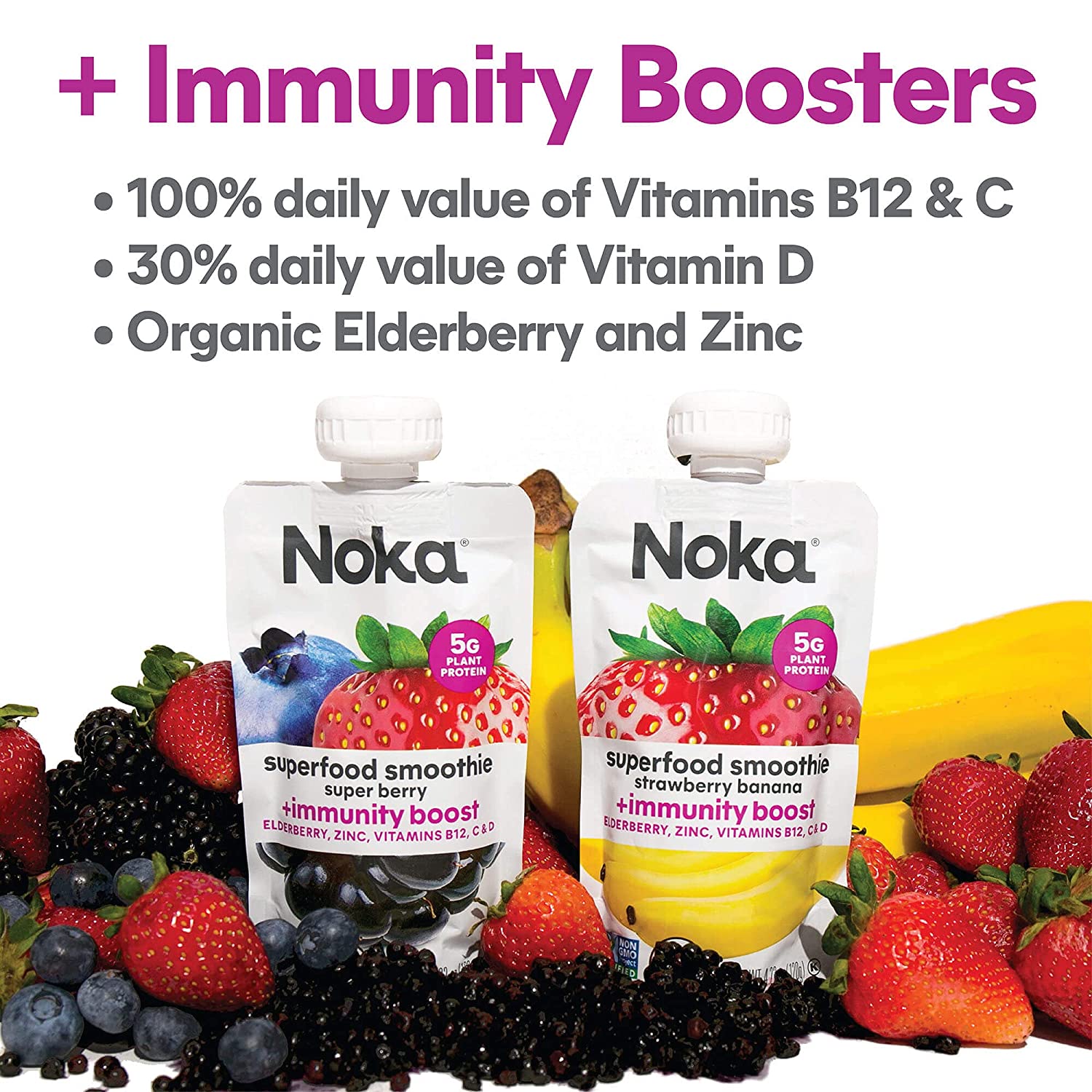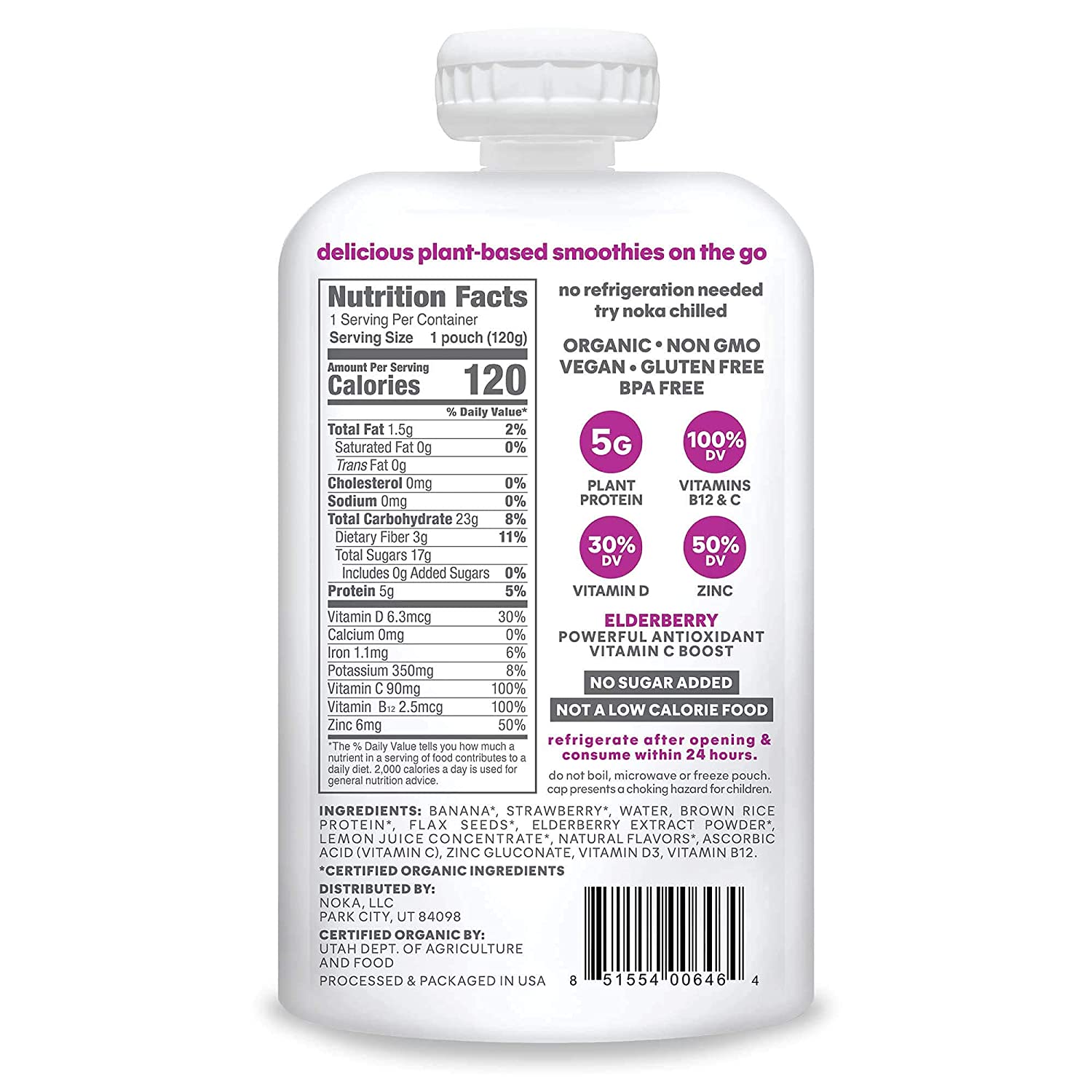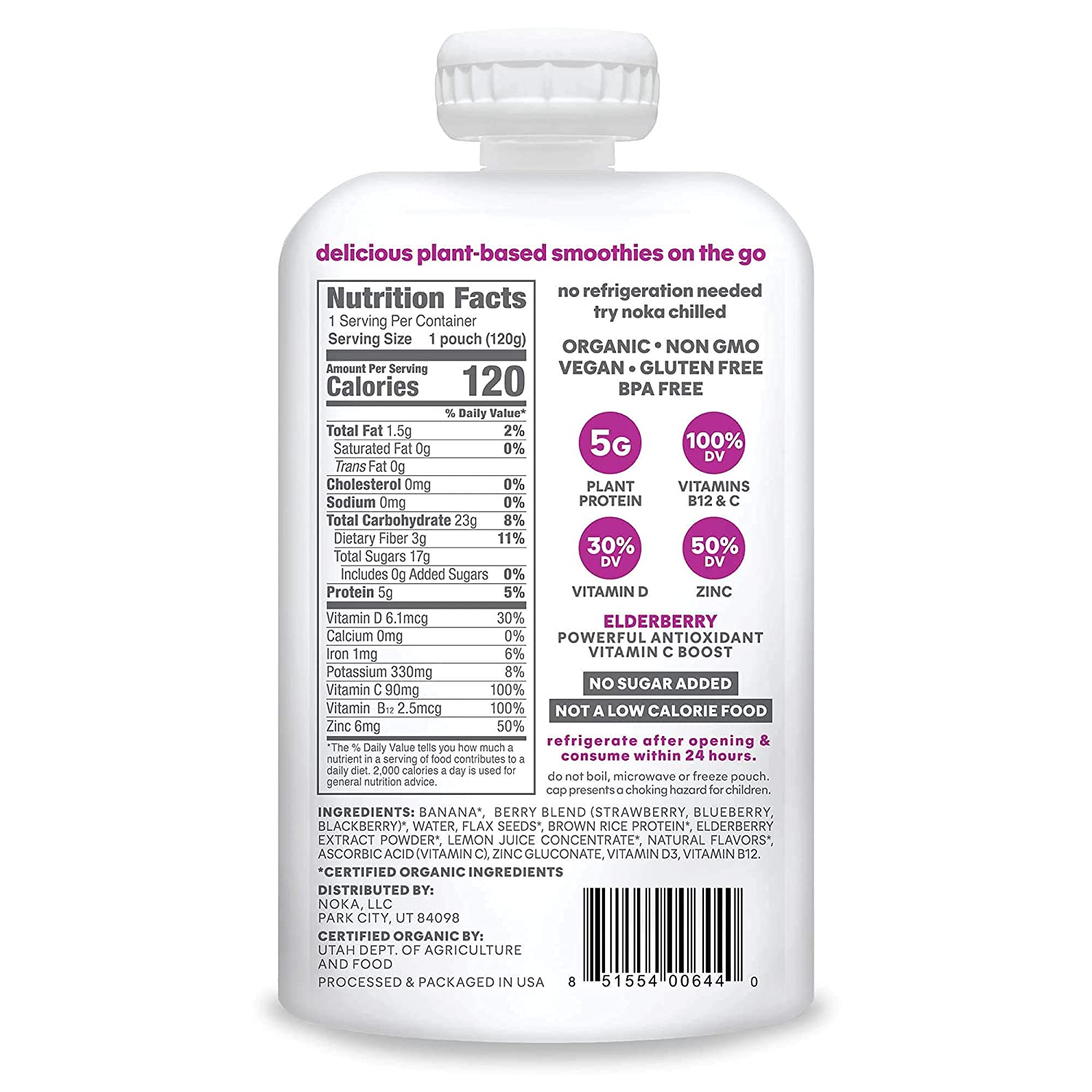 Noka Superfood Fruit Smoothie Pouches, Super Berry with Immune Support, Healthy Snacks with Flax Seed, Elderberry and Plant Protein, Vegan and Gluten Free, Organic Squeeze Pouch, 4.22 oz, 6 Count