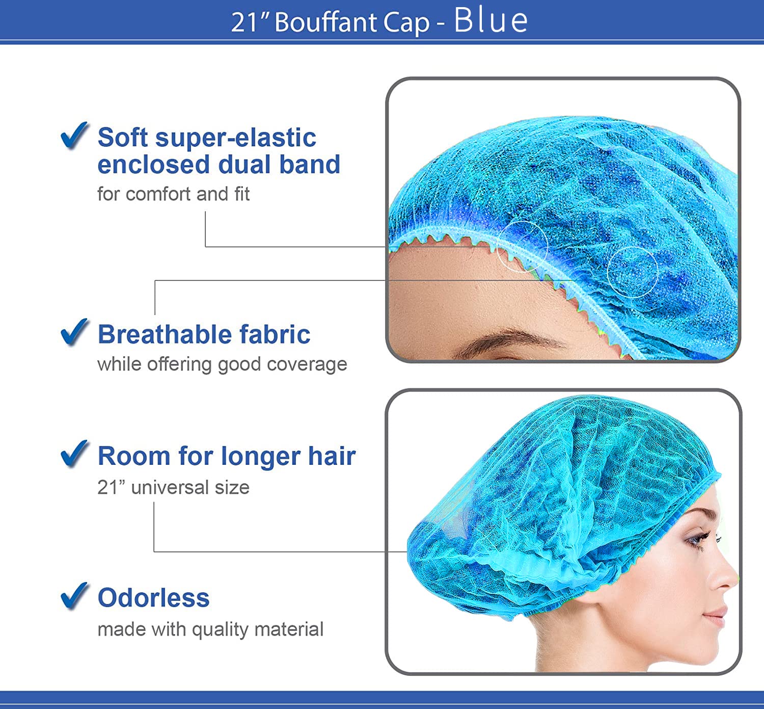 • [PRODUCT FEATURES] : 100Pcs/per pack, slightly elastic, breathable, 21 inches, 0.12 ounces each, not waterproof, Non-Woven hairnets, 100 % Spun-bonded Polypropylene.