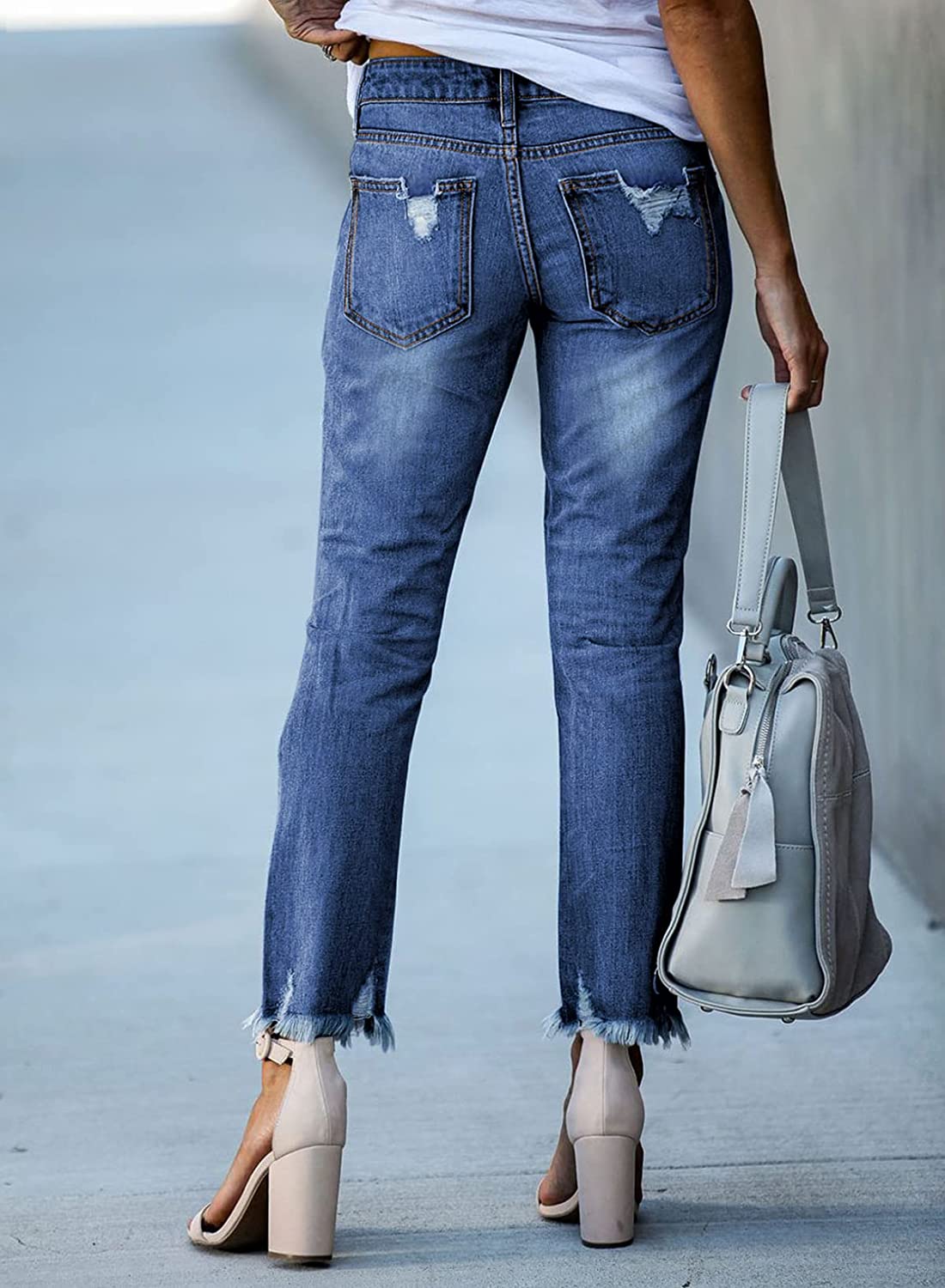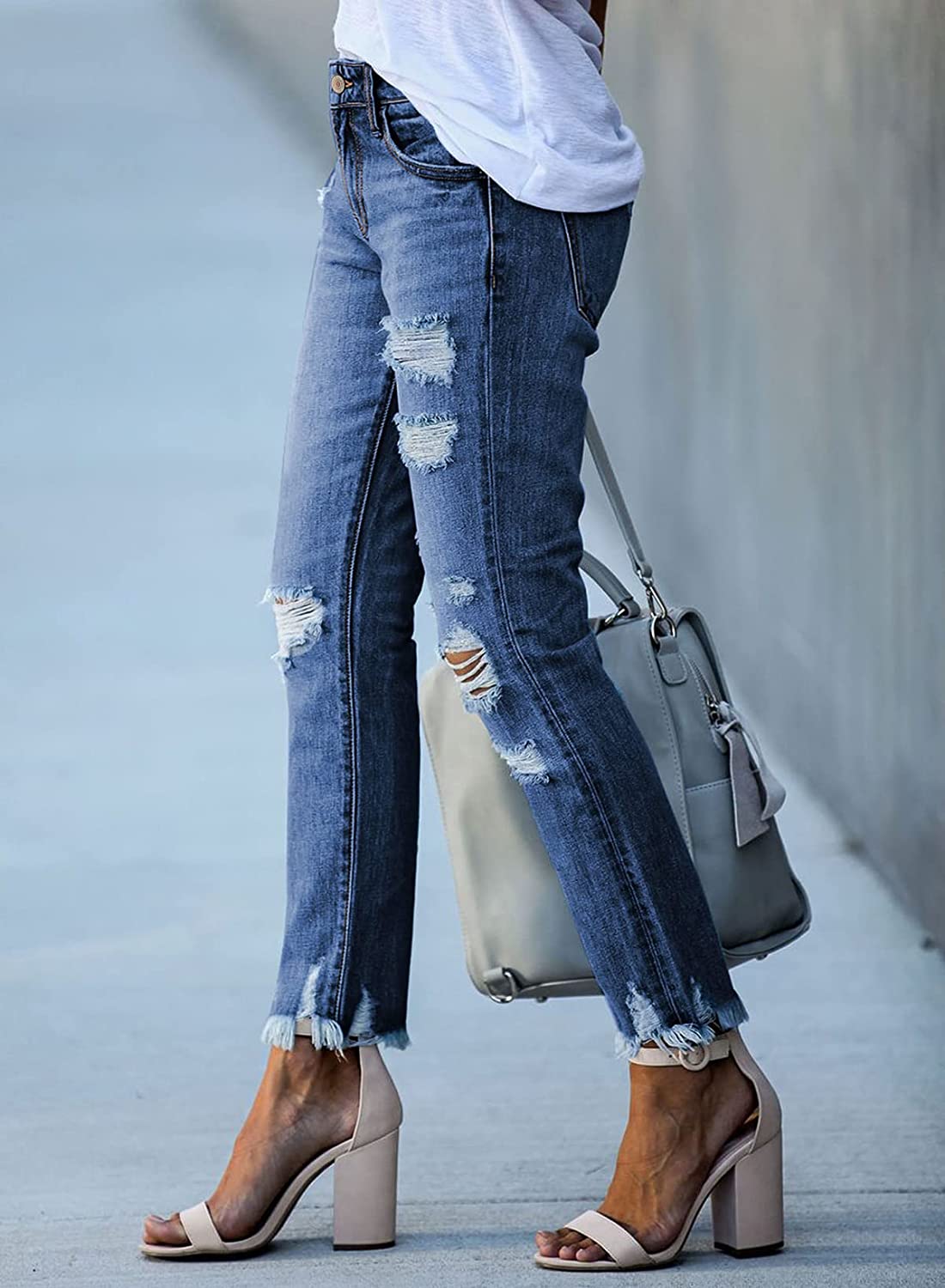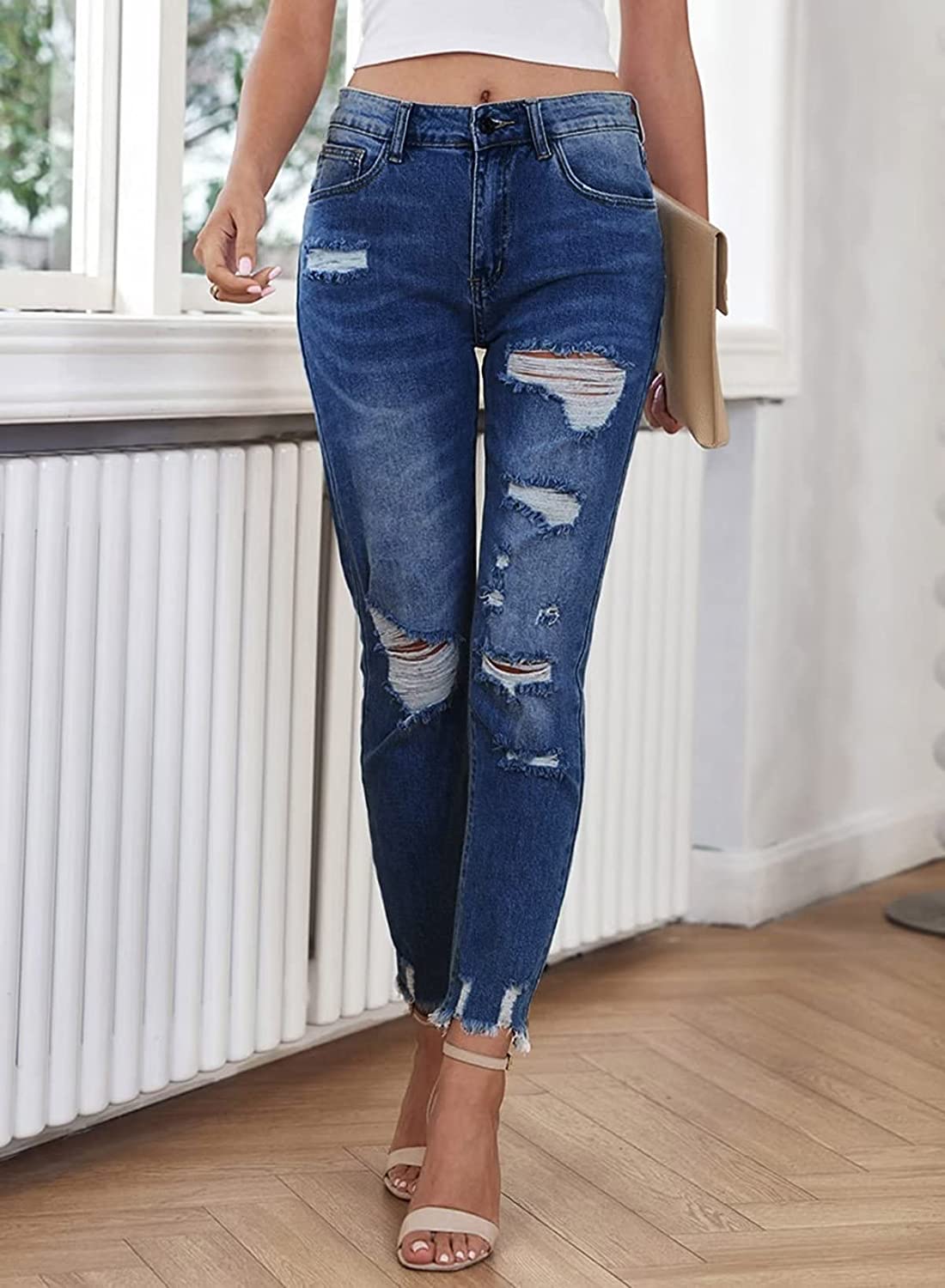 Distressed boyfriend jeans can add a trendy and edgy element to your outfit. They are typically loose-fitting with a relaxed cut and are designed to look like they have been worn and torn over time.The distressed details can range from small rips and tears to larger holes and frayed edges, giving the jeans a unique and casual look.