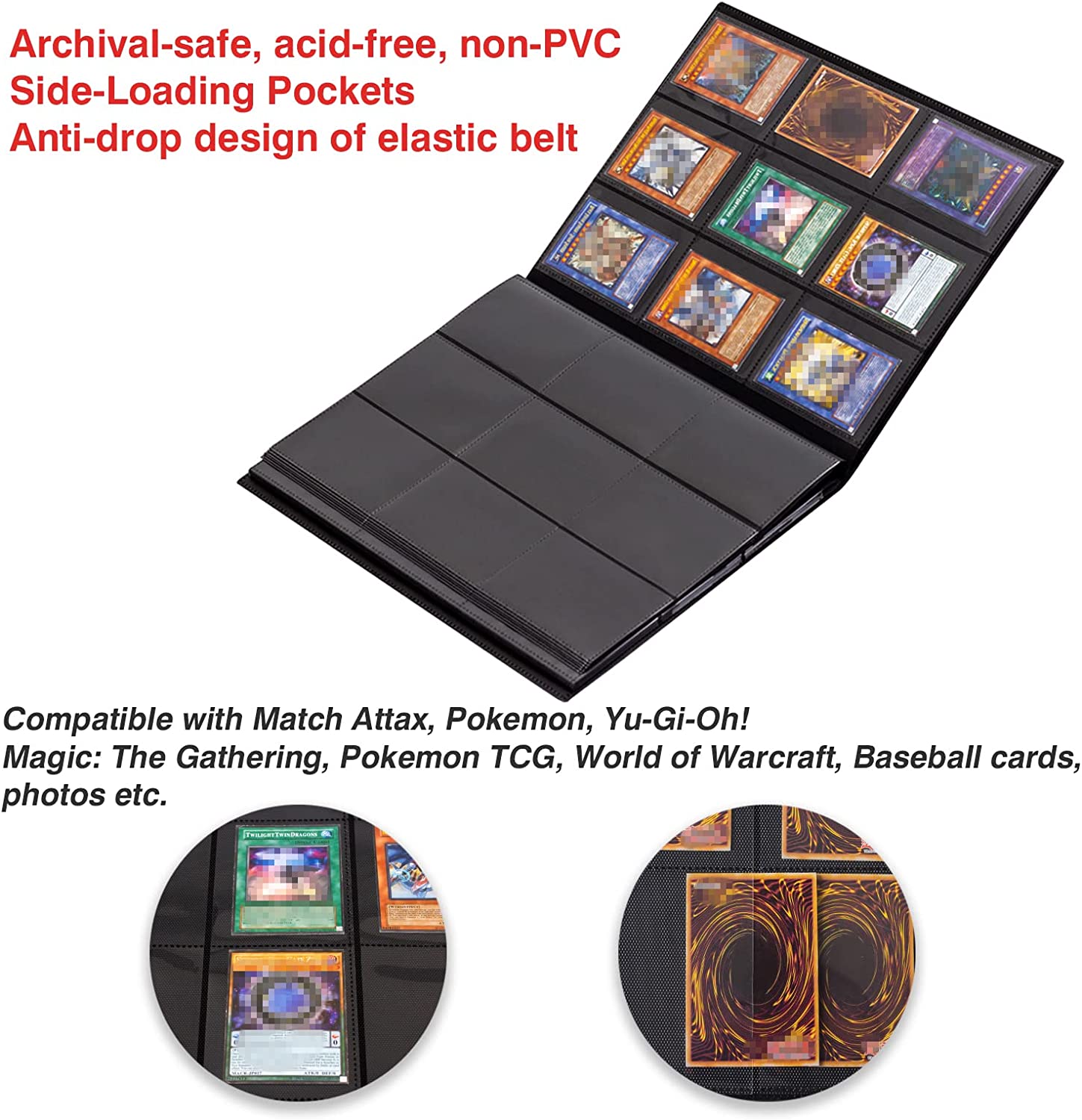 SECURE - Side-loading pockets designed to keep your cards securely in place. The outer cover of the folder is very sturdy and cannot bend under the pressure of the elastic closure. Meanwhile, a high-quality elastic band fastener keeps the trading card folder closed. No cards will spill.