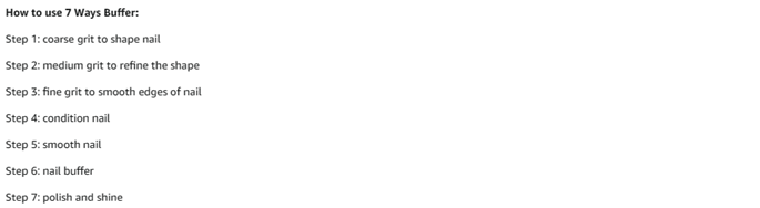 ❤7 Way Nail Buffer: 7 surfaces in 7 different colors showing 7 steps for filing and buffing nails; Every surface has every single different level of smoothness; each side is numbered for the order to use and shows the function of each surface. It can be a useful way to create naturally smooth nails.