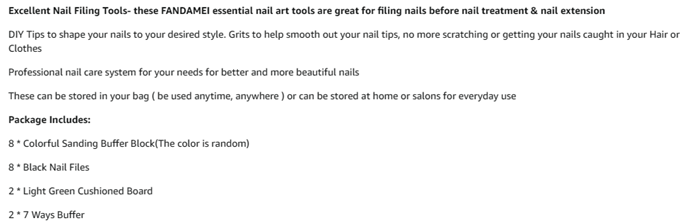 ❤Package Include: 8 pcs Colorful Sanding Buffer Block(The color is random) ,8 pcs Black Nail Files,2 pcs Light Green Cushioned Board and 2pcs 7 Ways Buffer. One professional manicure tool kit of 4 types useful nail tools,great value.
