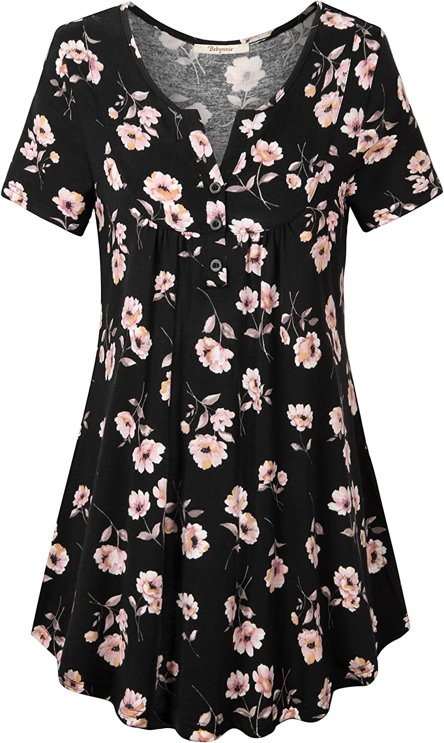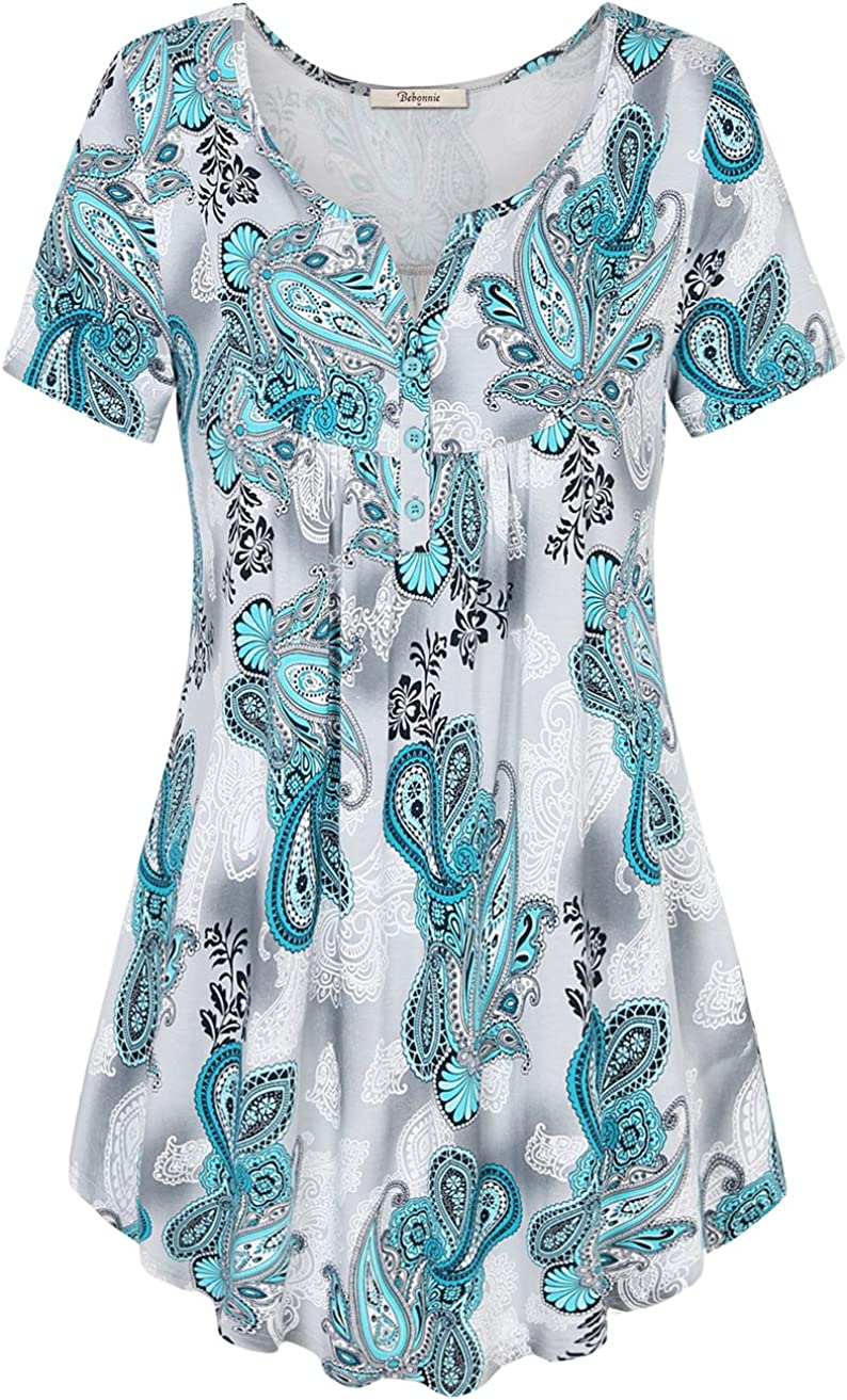 Bebonnie Women's Vintage Short Sleeve V Neck Pleated Tunic Shirt