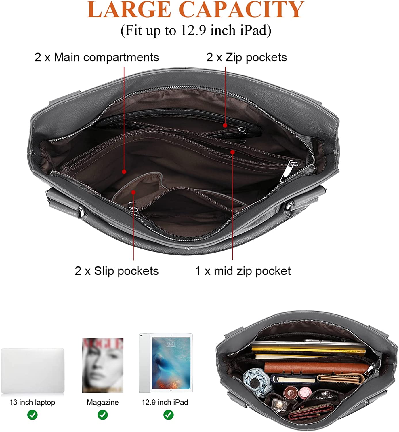 WELL STRUCTURE -- EXTERIOR: 2 small front zipper pockets, 1 back zipper pocket. INTERIOR: Zipper open to one large compartment with 2 slot pockets and 2 small zipper pockets. This leather hobo tote bag availabve to hold your 12.9 inch iPad, 12inch Macbook Pro, sunglasses, wallet and other essentials.
