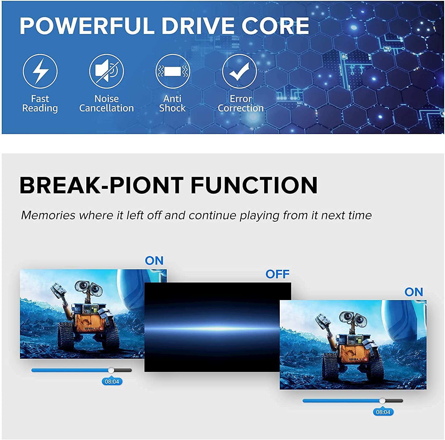 Support play from the place where you left off, no worry about playing from the beginning over again every time you restart the player. Newest drive core support reading disc faster, quieter and expel heat effectively. Error correct function allow you to load the slightly damaged DVDs without issue