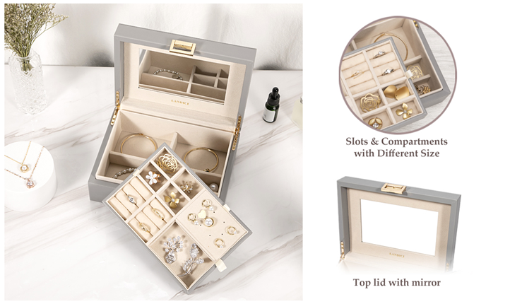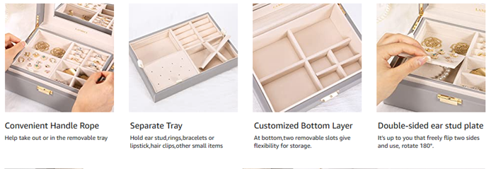 - Customized Inside Layout - The inside slots are interchangeable so you can switch it around to your liking.The second layer gives flexibility for storage larger items.It has 2 removable slots and turn into 7 compartments,All of the dividers are really well sized and removable so you can tweak it to your desire.Holding sunglasses,earrings,rings,necklace,bracelet,watch,brooches and hair accessories.