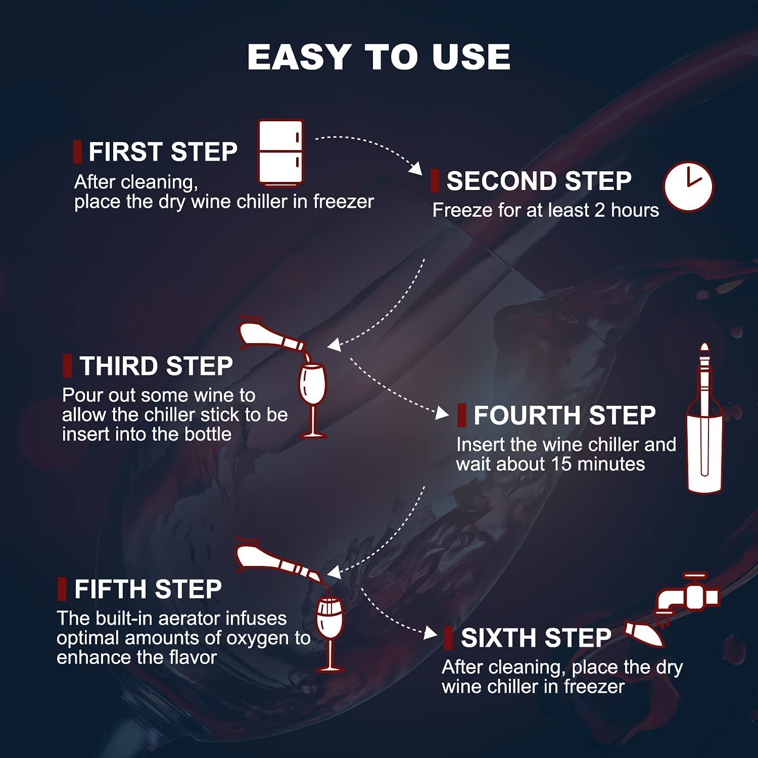 ? EASY TO USE - Just put it in the freezer for about one hour before using until the cooling gel in the chiller stick is frozen. After pouring a little wine out of bottle, insert wine chiller into bottle and enjoy perfectly chilled wine for up to two hours. Drip-free pouring spout to avoid any drips or spills.