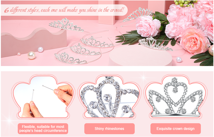 Exquisite design: our princess crystal crowns are designed with 6 different styles, including heart shape, water drop shape, flower shape, etc., the crystal combines with various patterns, making you shine and stand out in the crowd while wearing the tiara